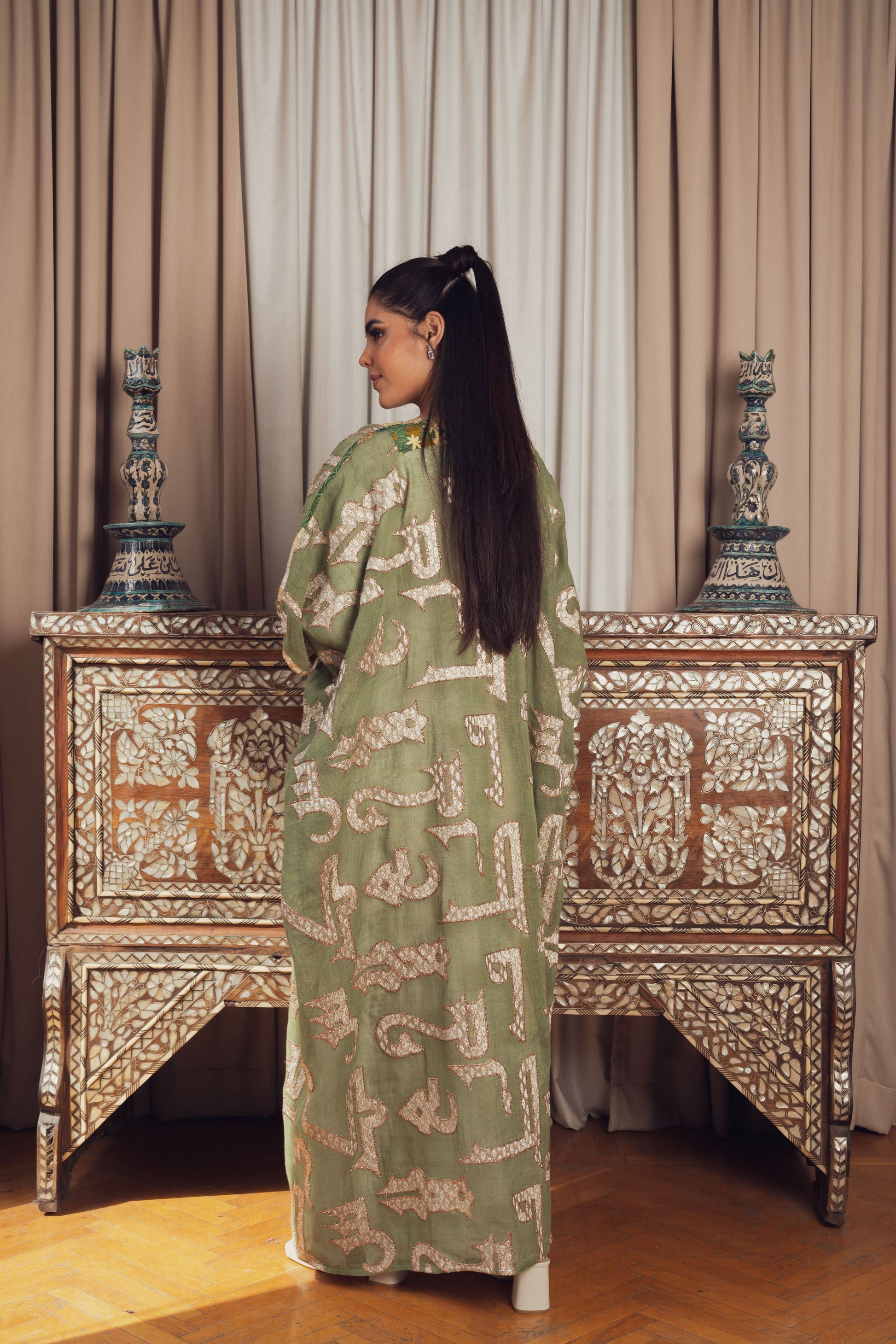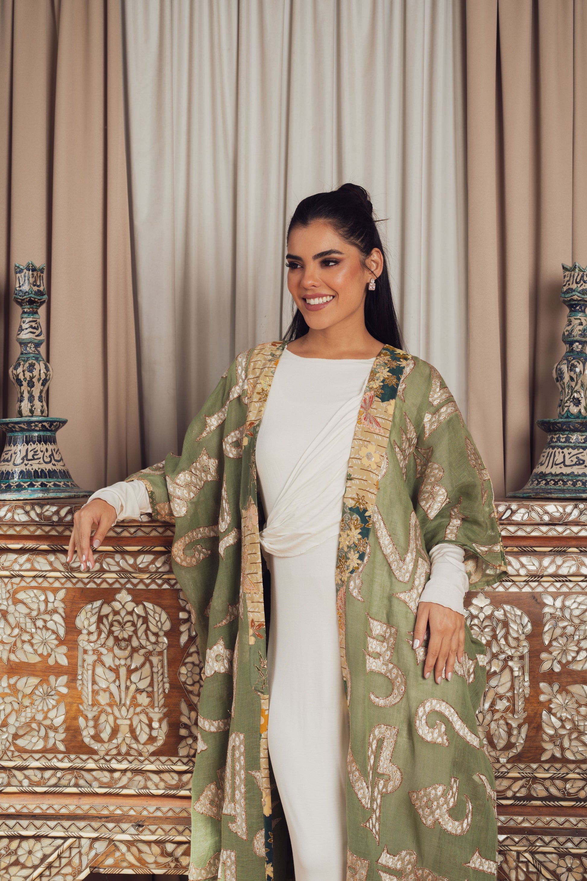 A chic olive green open-front kaftan adorned with intricate gold embroidery in calligraphic patterns, paired with a white ensemble for a sophisticated and modern look.