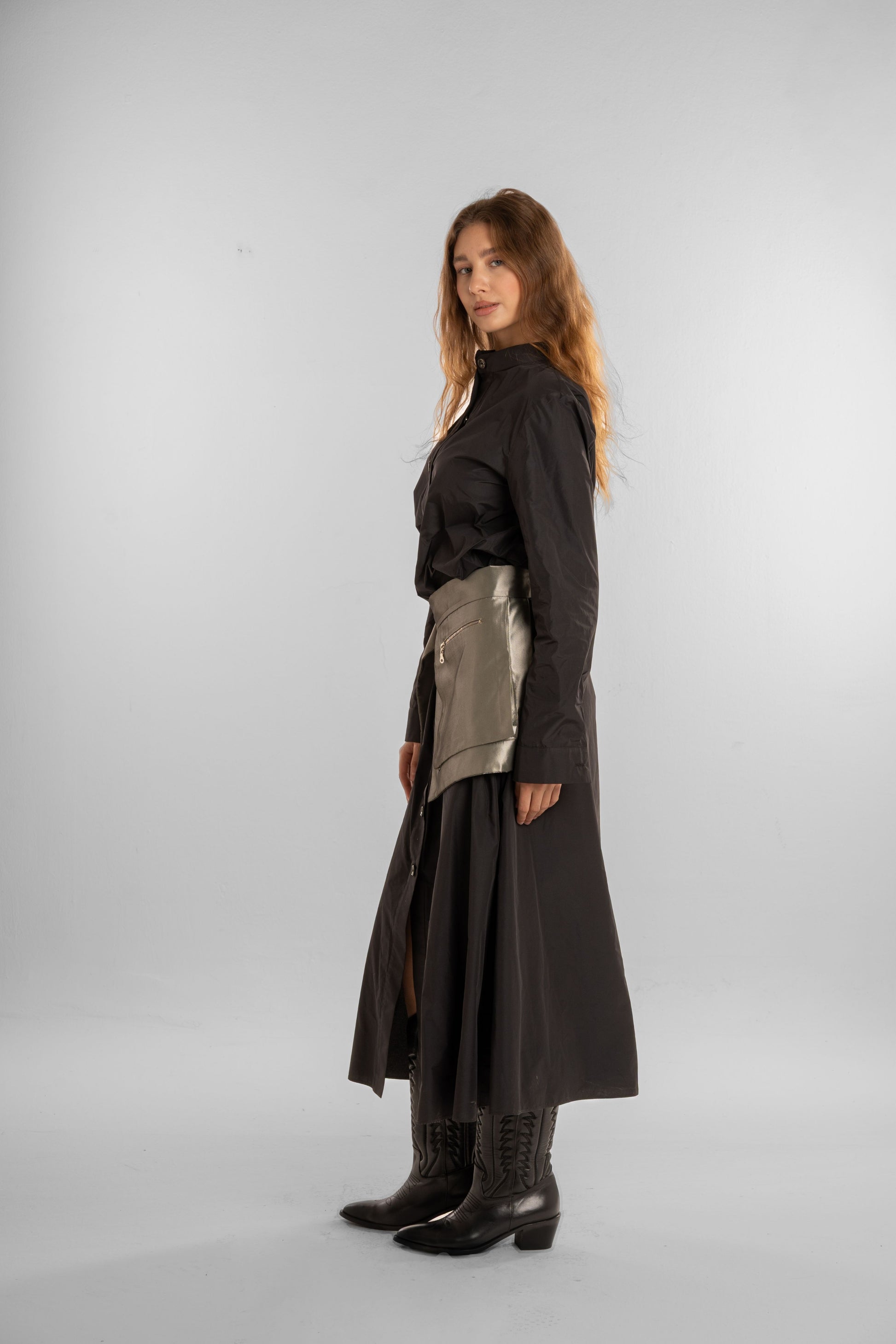A timeless black long dress designed with an elegant silhouette and finished with an olive waist belt that defines the figure beautifully. Perfect for evening events or special occasions, offering a chic and sophisticated look with minimal effort.