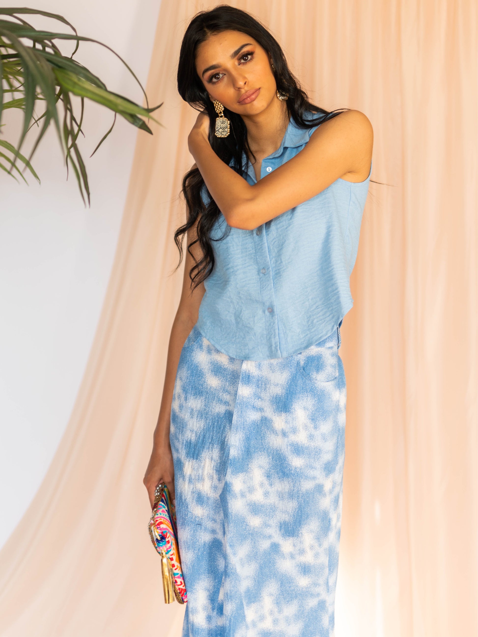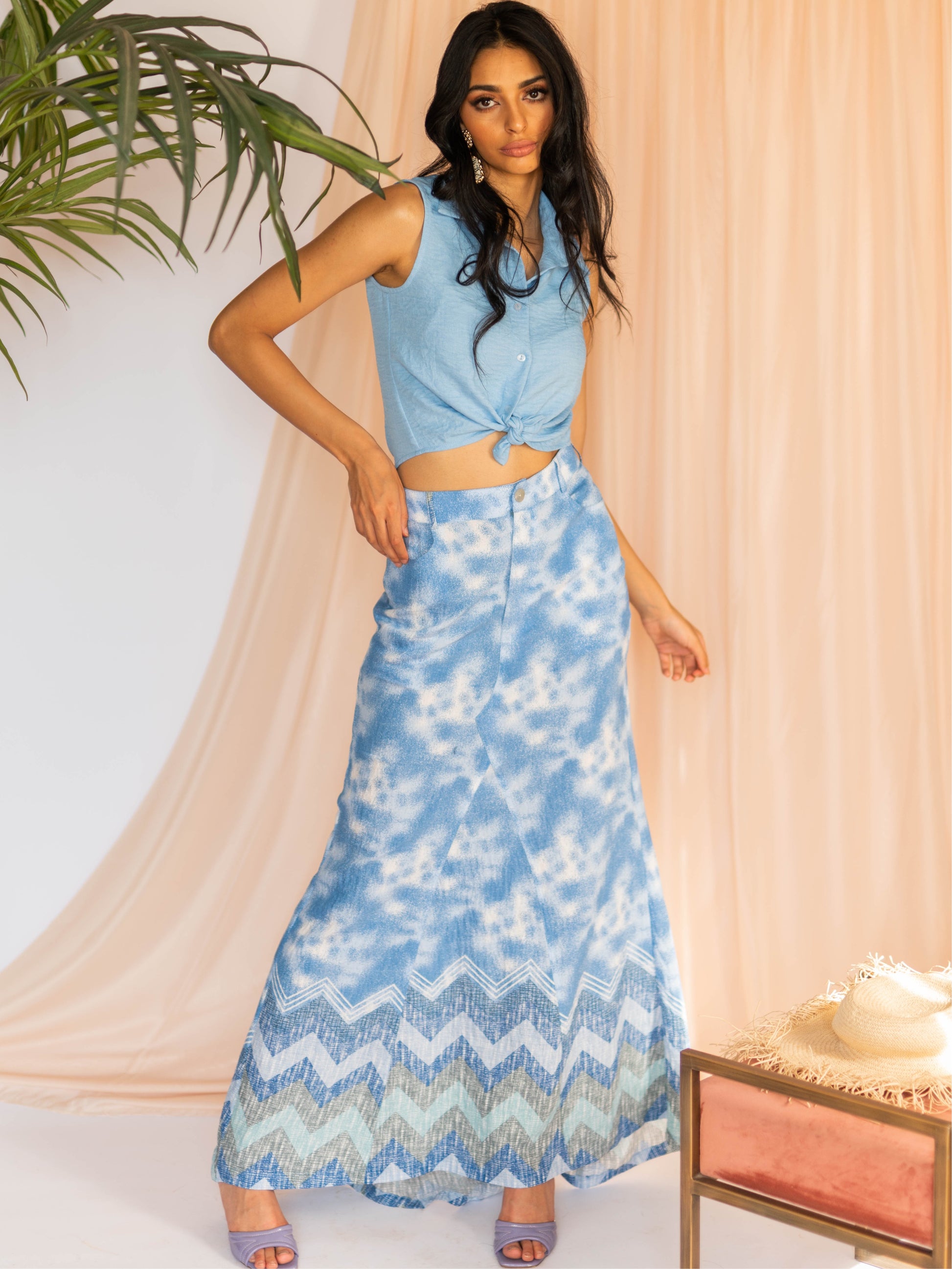 Stay fresh in our Sky Blue Linen Set , featuring a buttoned shirt that you can tie or wear it separately and a maxi skirt with two front and two back pockets.