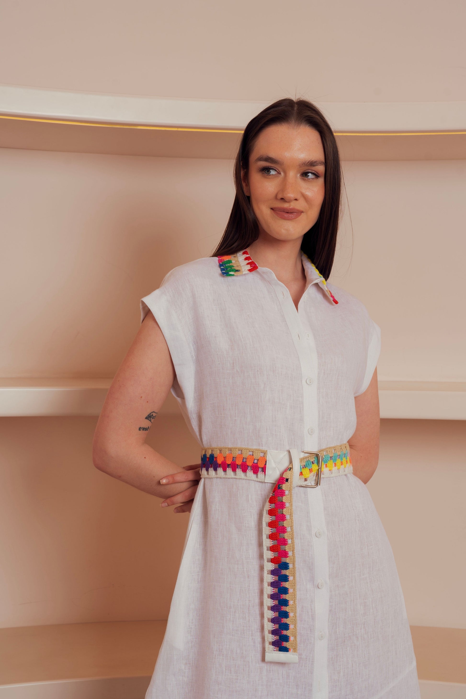 White button-down midi dress with colorful embroidered belt and collar accents.