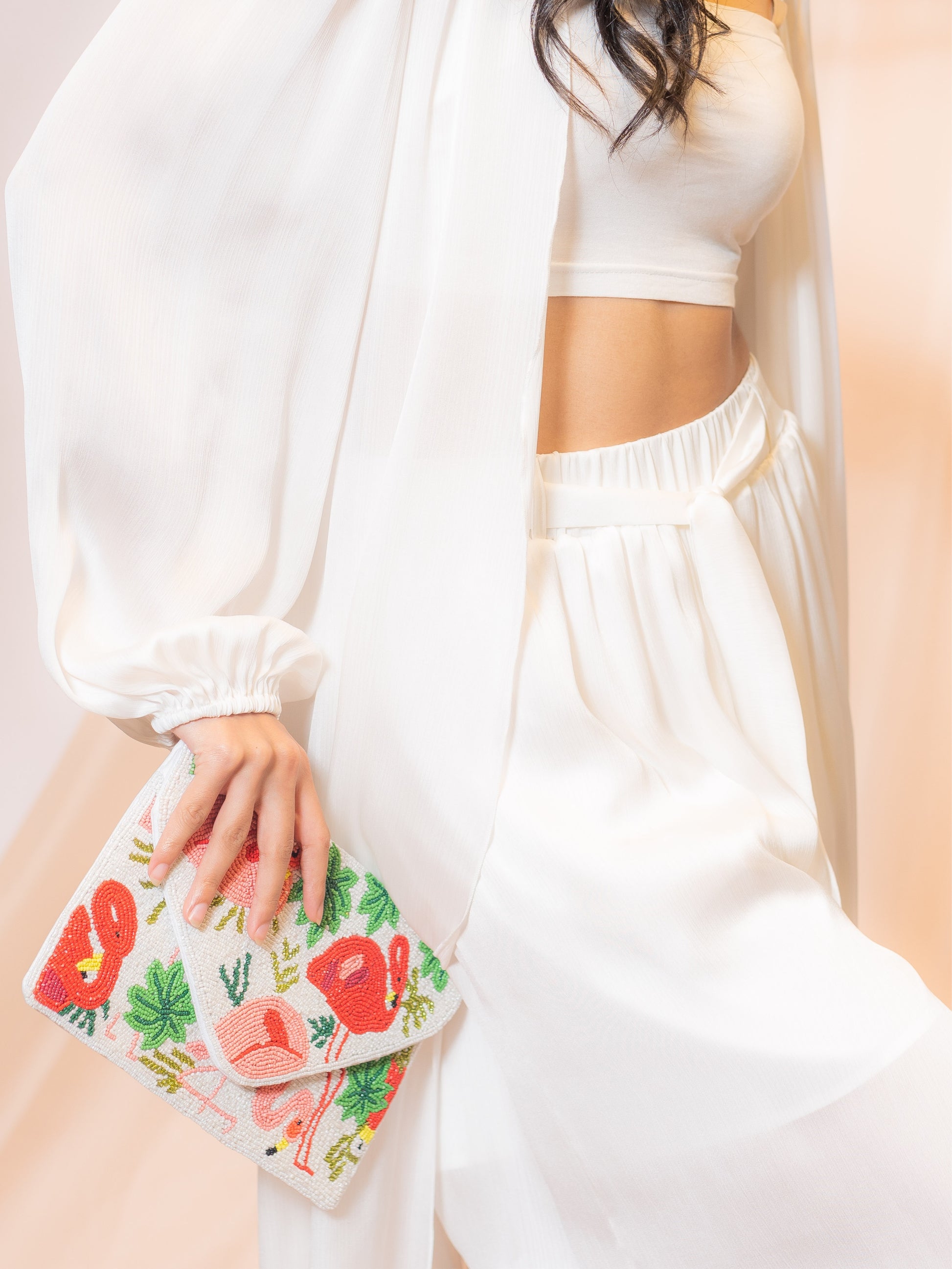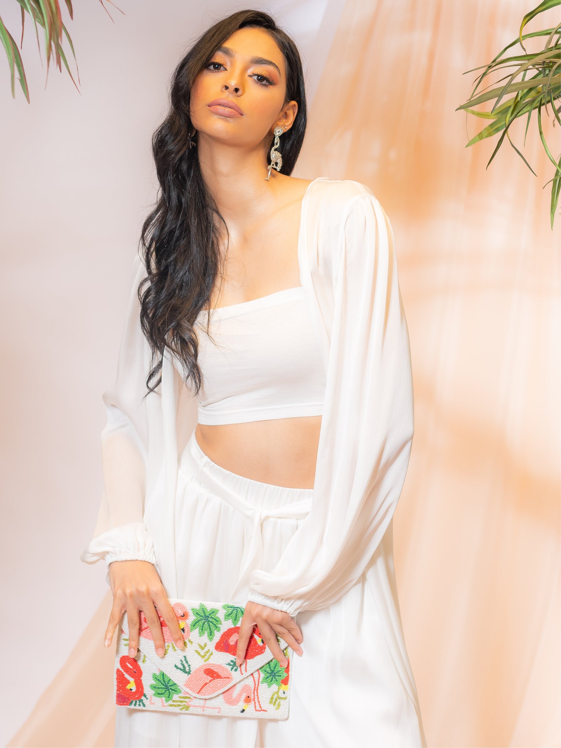 Crafted from genuine silk chiffon imported from London, UK. Here is our White Cloud Set handcrafted in our atelier. This design features long  ballooned sleeves with elasticated cuffs kimono, wide pants with a tie belt.