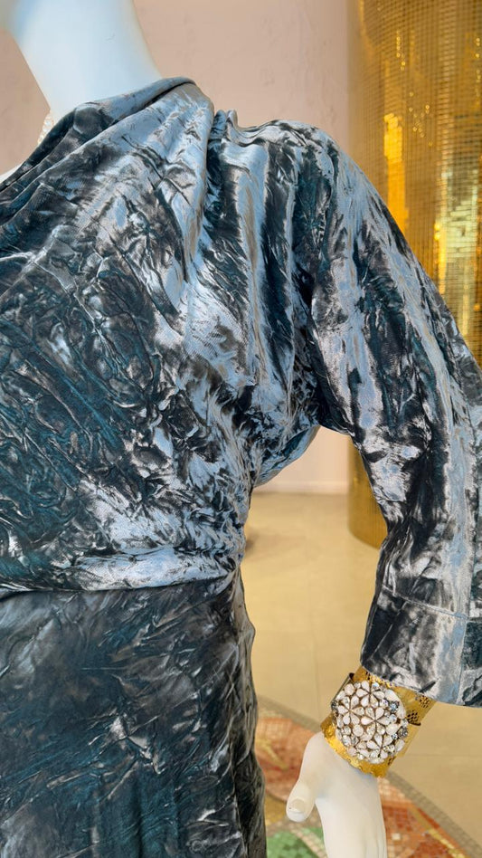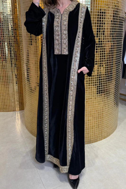 A stunning, gold-embroidered kaftan with flowing sleeves