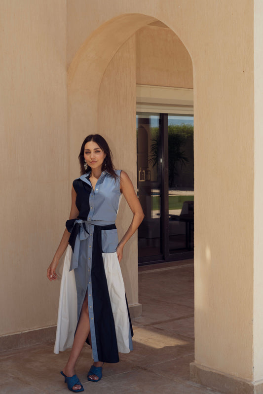 Blue Ikat Print Midi Dress with Puff Sleeves.