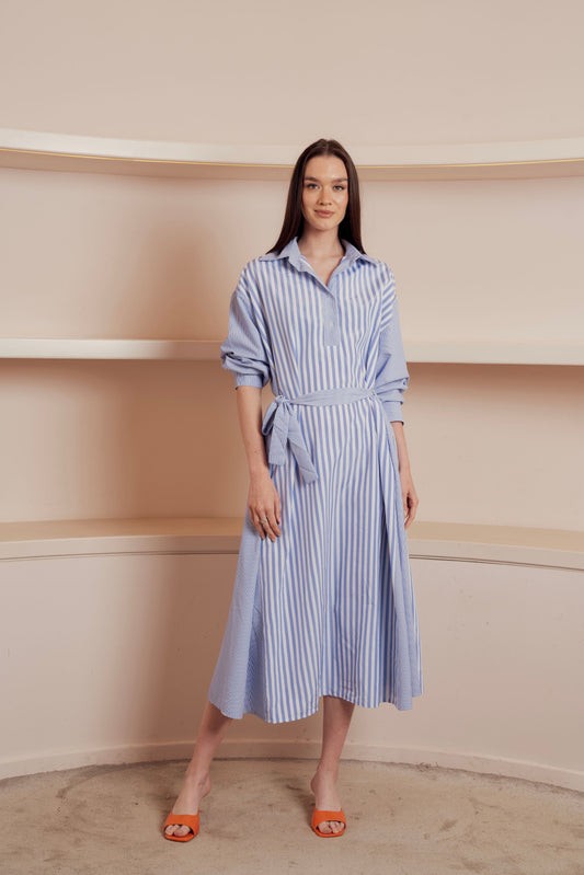 Blue and white striped shirt dress with waist tie and rolled-up sleeves.