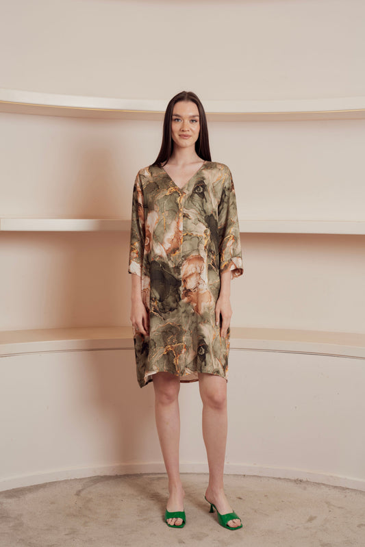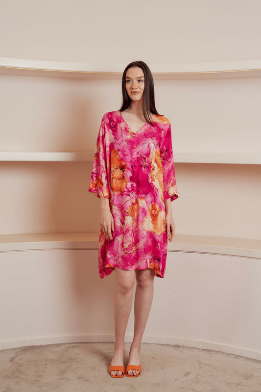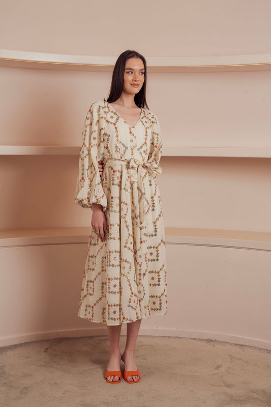 Cream floral embroidered dress with balloon sleeves and a waist tie.
