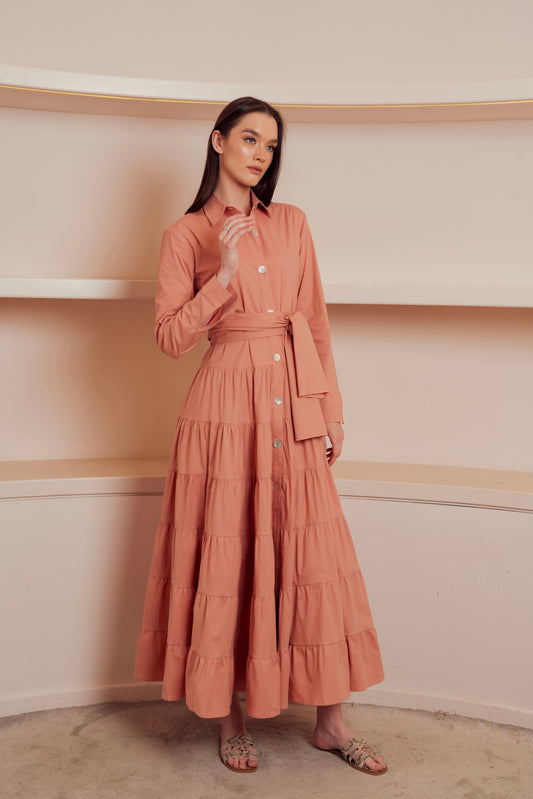 White button-down midi dress with colorful embroidered belt and collar accents.