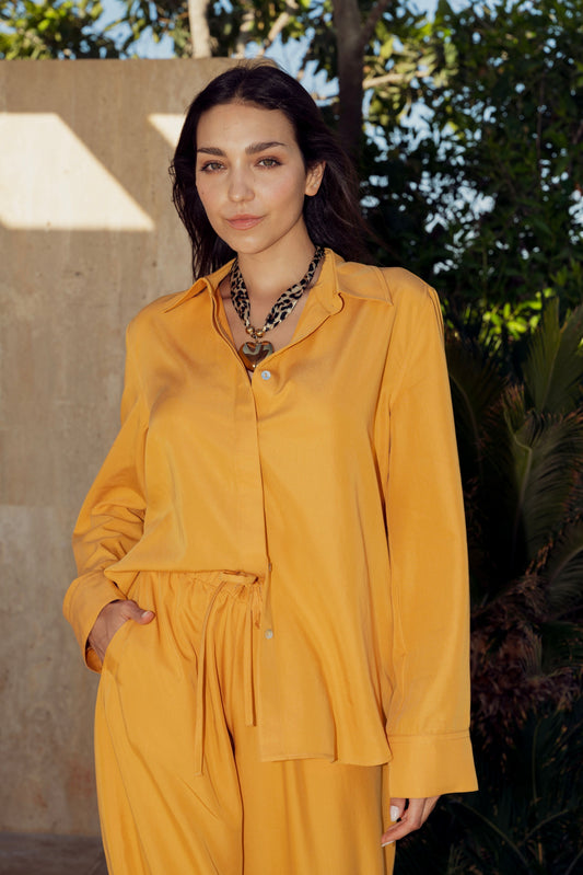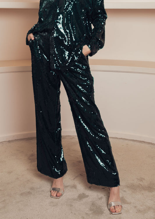 Coordinating wide-leg trousers with a matching geometric and tropical border print.