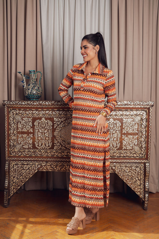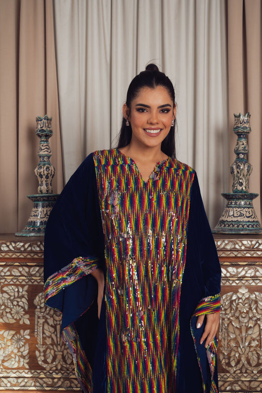 A stunning, gold-embroidered kaftan with flowing sleeves