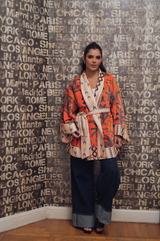 The deep black of this kimono provides the perfect backdrop for the vibrant