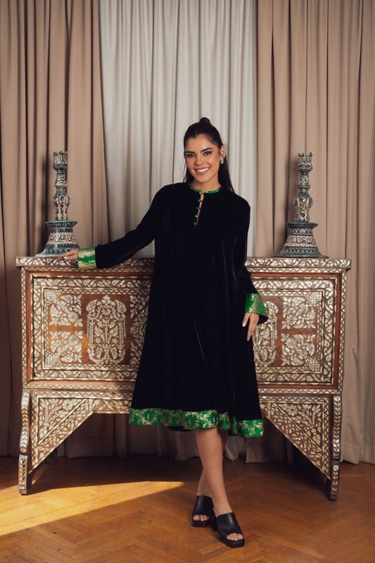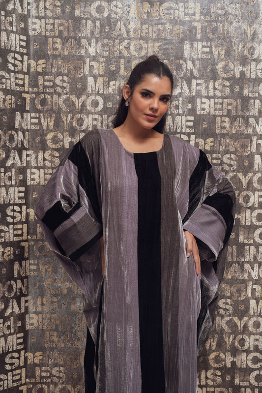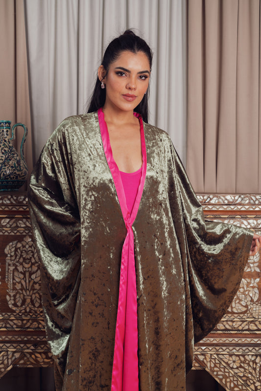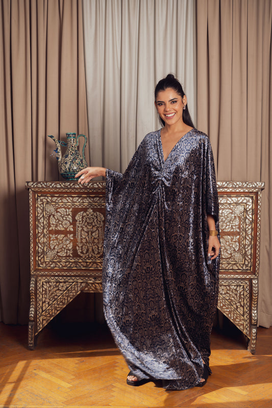 A stylish open-front kaftan featuring a geometric print in earthy tones