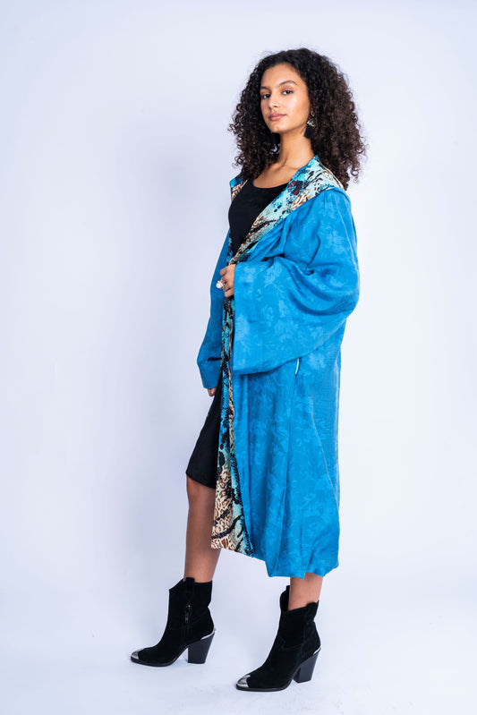 A dress made of silk, with a wide cut and a print in a variety of colors.