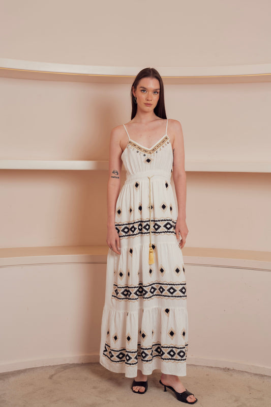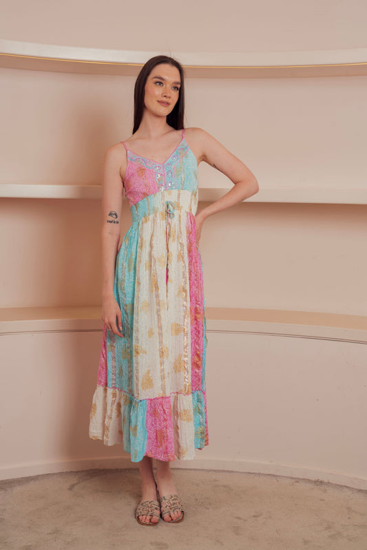 Blue Ikat Print Midi Dress with Puff Sleeves.