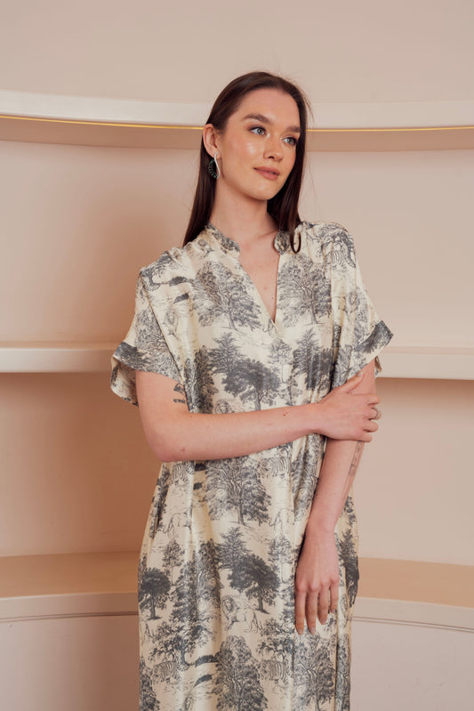 Cream floral embroidered dress with balloon sleeves and a waist tie.