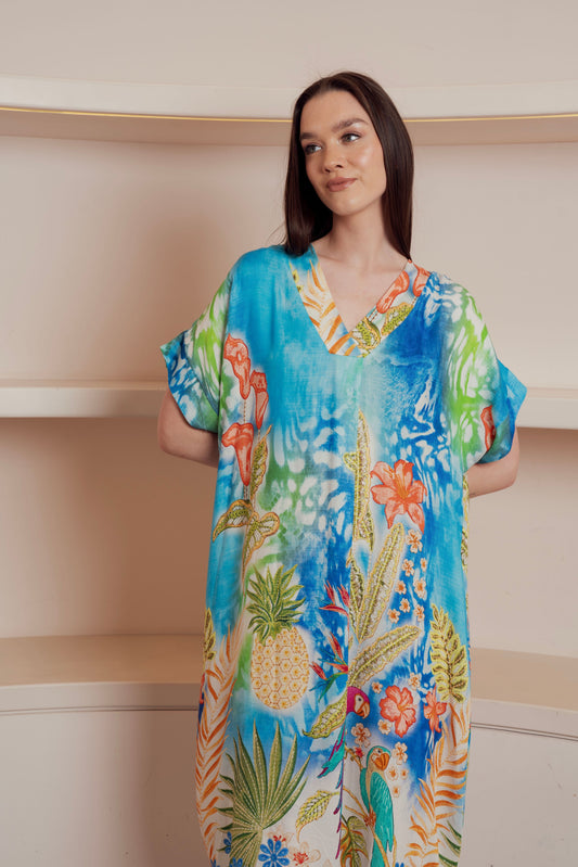 White button-down midi dress with colorful embroidered belt and collar accents.