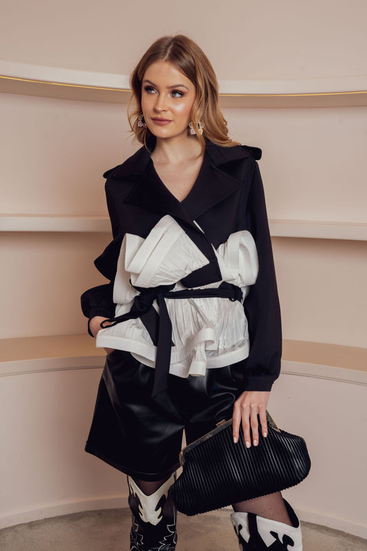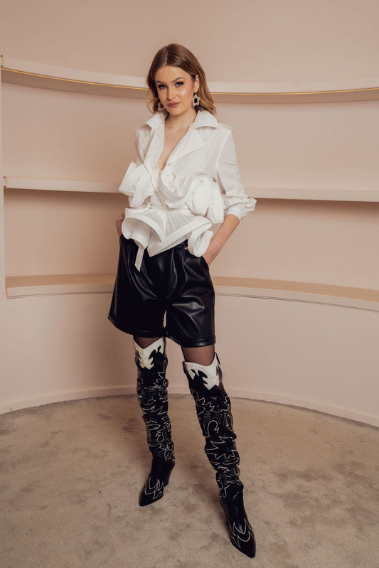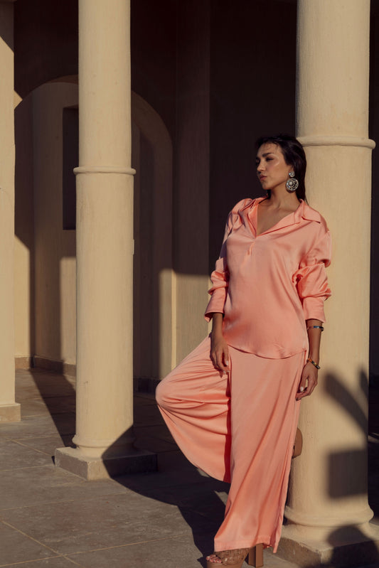 Light button-up blouse with a soft pink geometric pattern and tropical floral print at the hem.