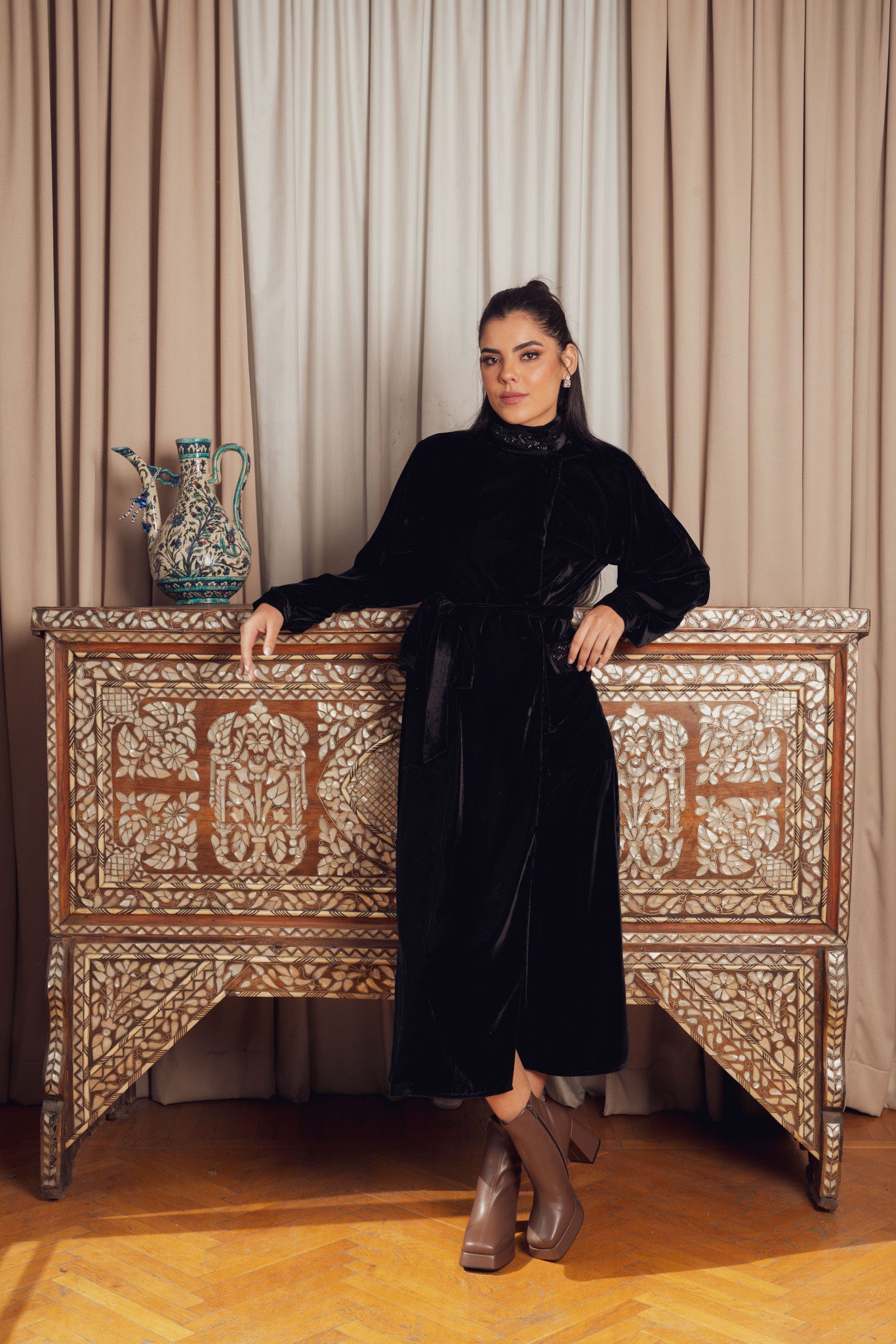 The outfit features a luxurious black velvet dress with a high neckline adorned with delicate embellishments. The dress has voluminous sleeves, a fitted waist with a matching velvet belt, and intricate detailing on the cuffs and pockets, adding a touch of elegance and sophistication.