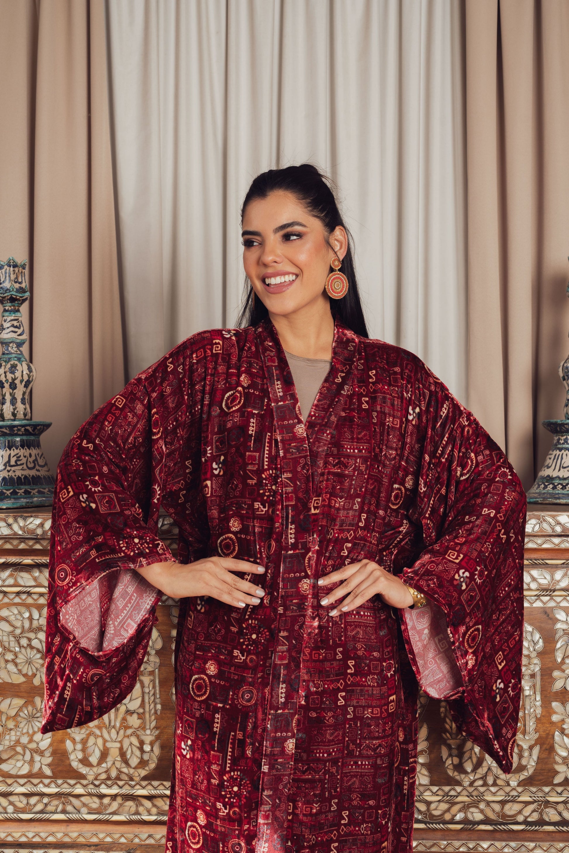 A luxurious deep red velvet kaftan with intricate gold geometric patterns, wide sleeves, and a relaxed silhouette, styled with statement earrings and white open-toe heels.