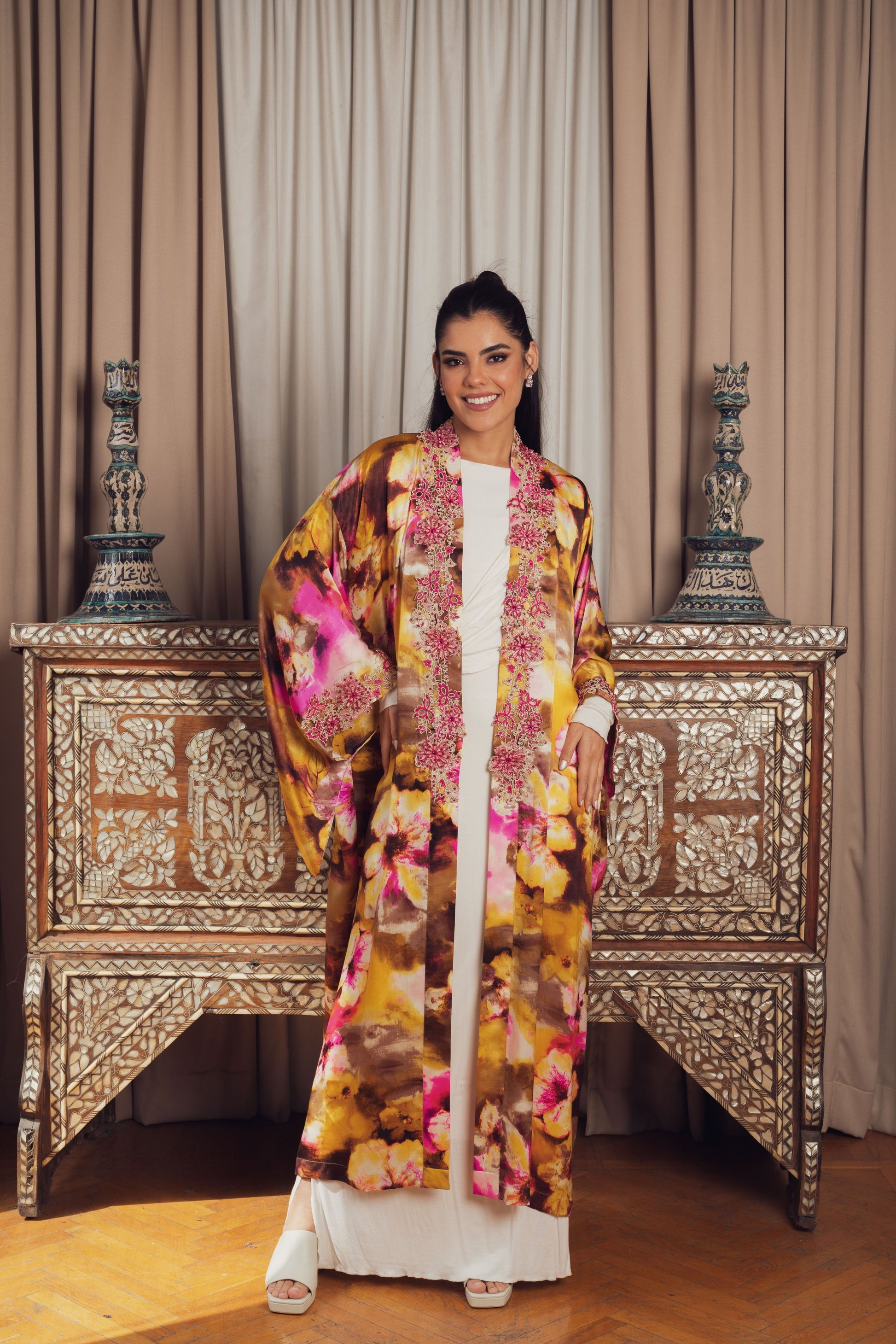 A vibrant open-front kaftan featuring an abstract floral print in warm tones of gold, brown, and pink, complemented by intricate pink embroidery along the front, paired elegantly with a white outfit.