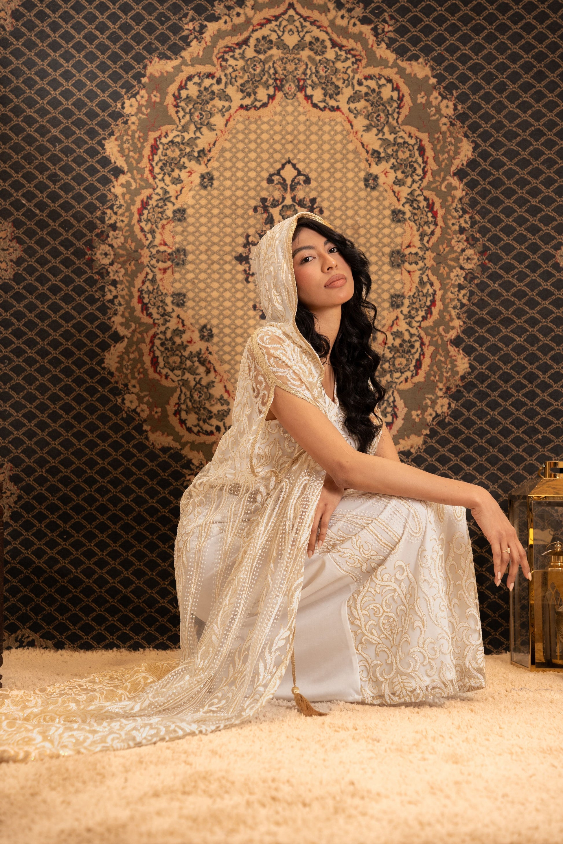 An elegant white and gold embroidered kaftan with a hood, featuring intricate lace detailing and flowing sleeves, accessorized with a delicate gold tie at the neckline.