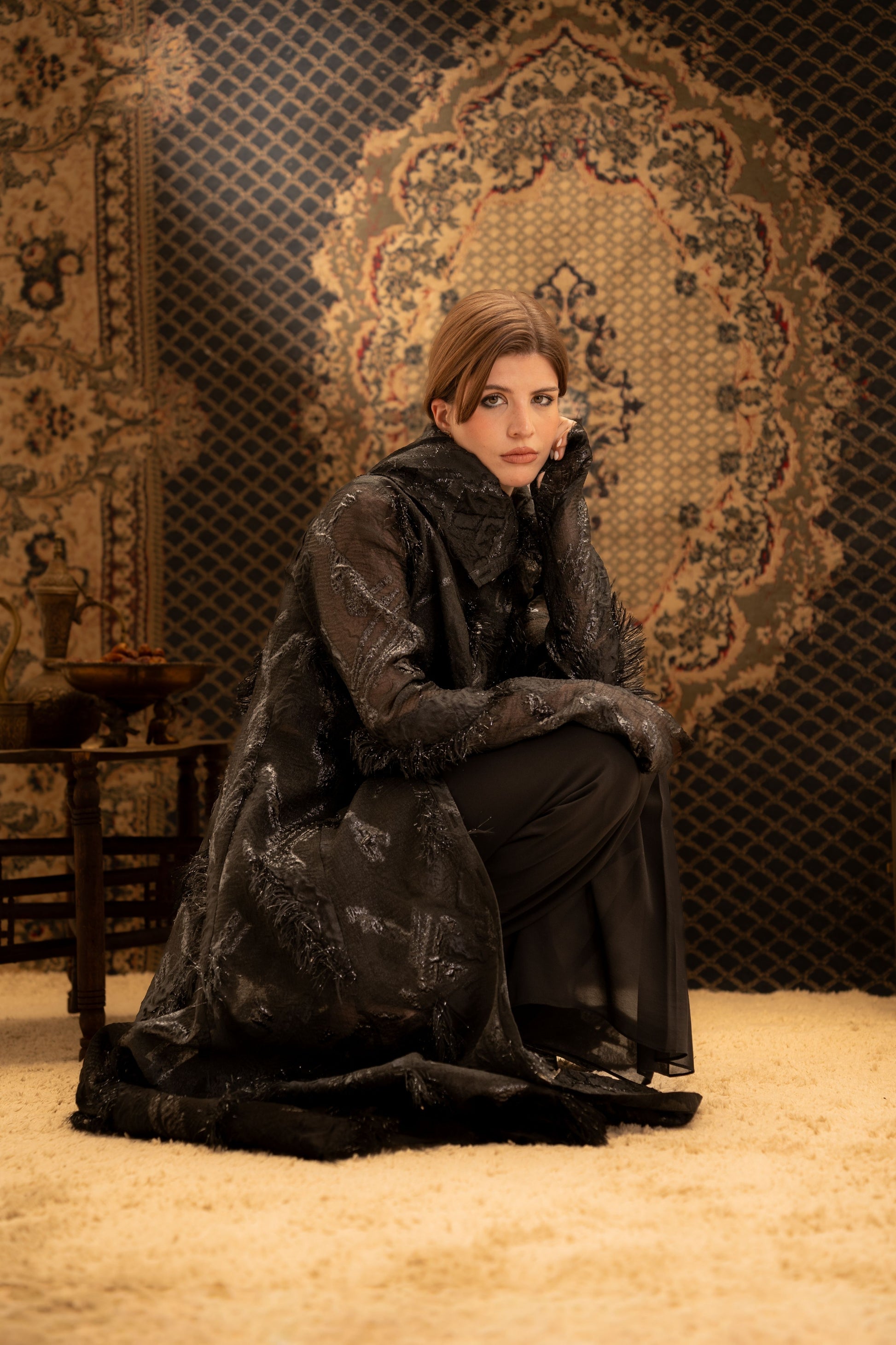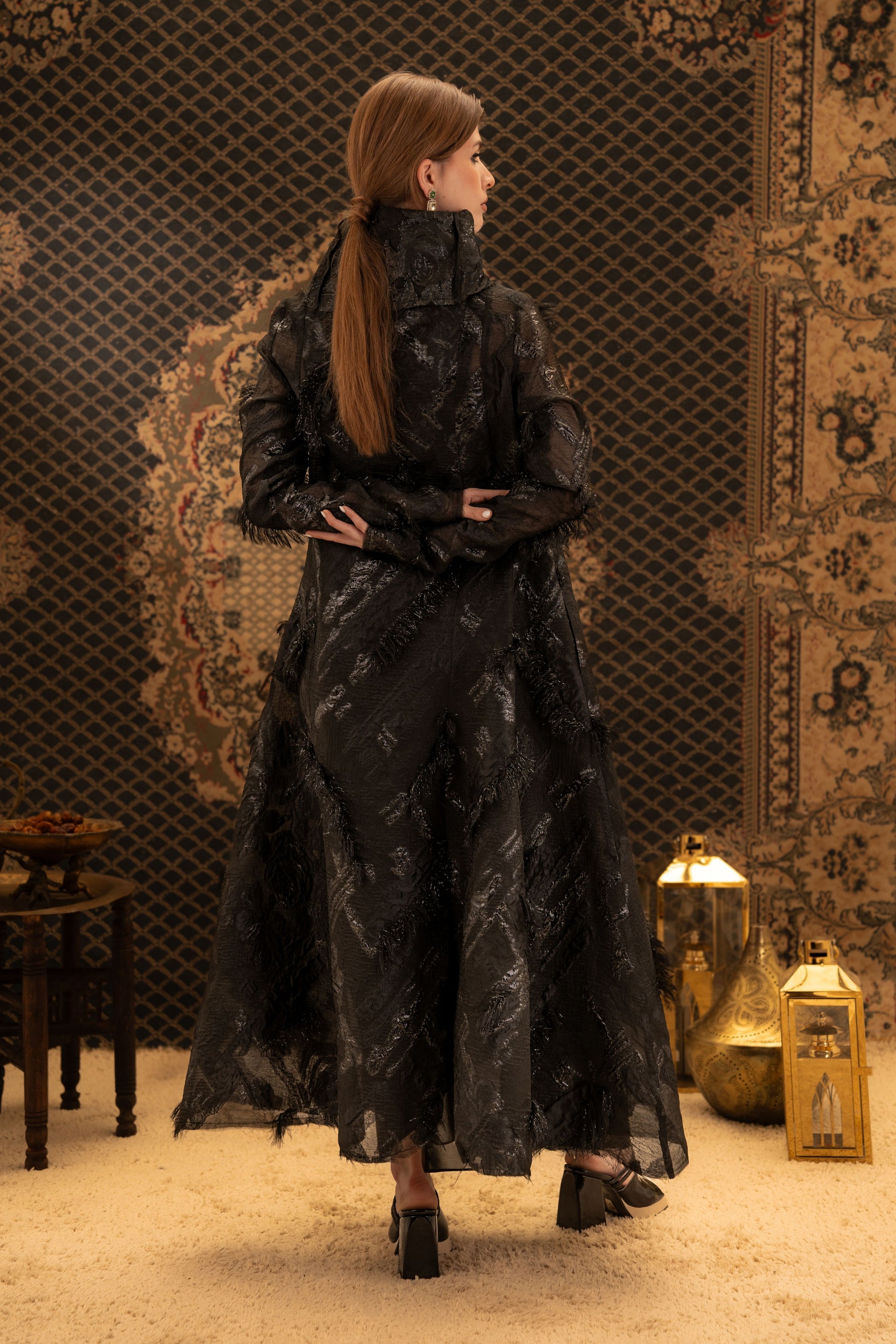 An elegant black kaftan crafted from lightweight organza with subtle textured prints that add depth and dimension. Designed with a button-down front and soft flowing silhouette, this piece blends modern structure with timeless sophistication.