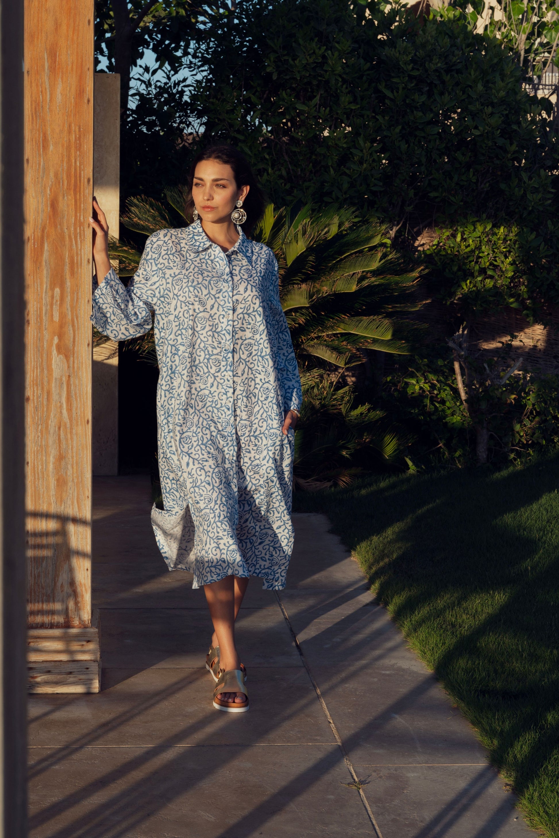 Blue and White Printed Shirt Dress with Pockets