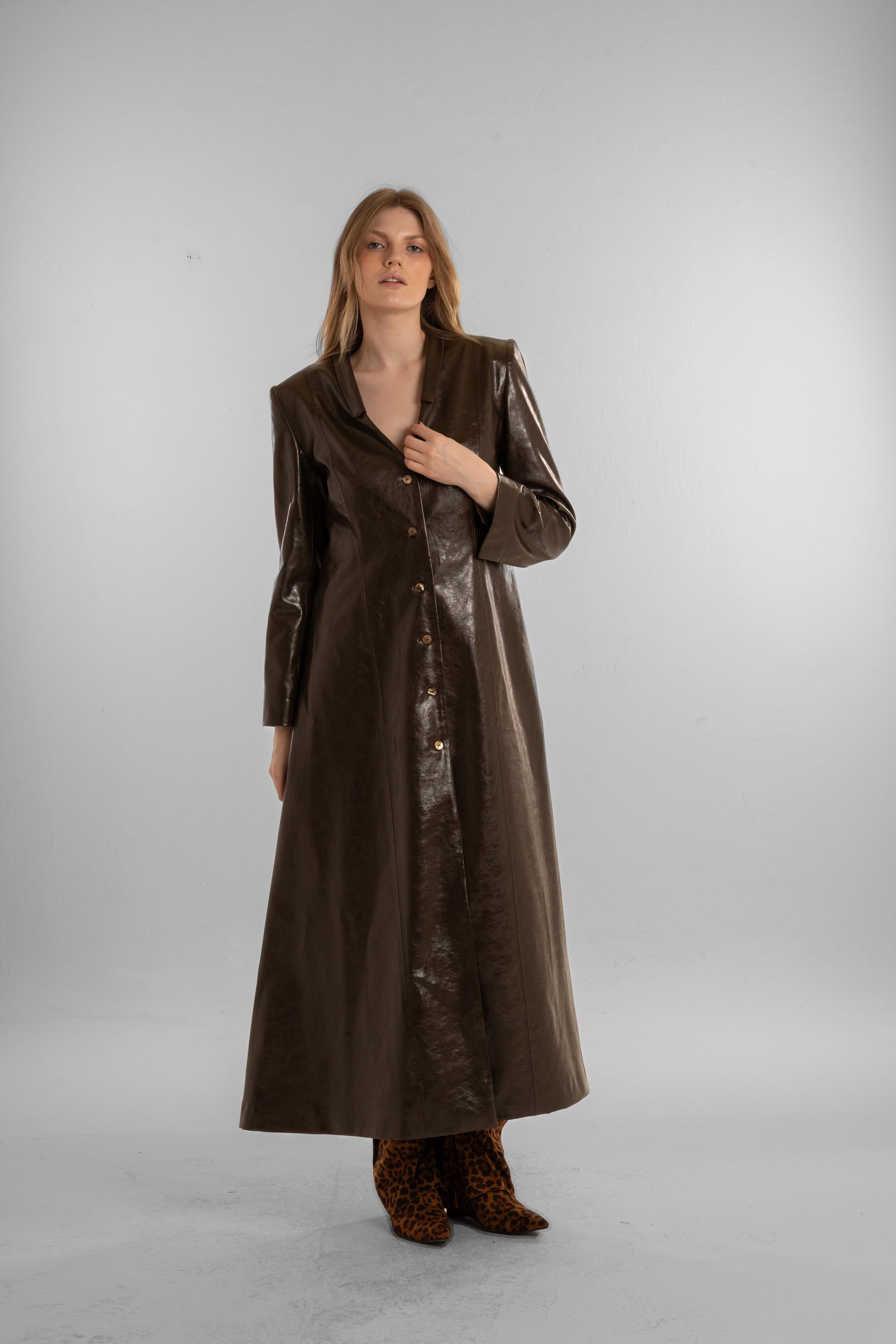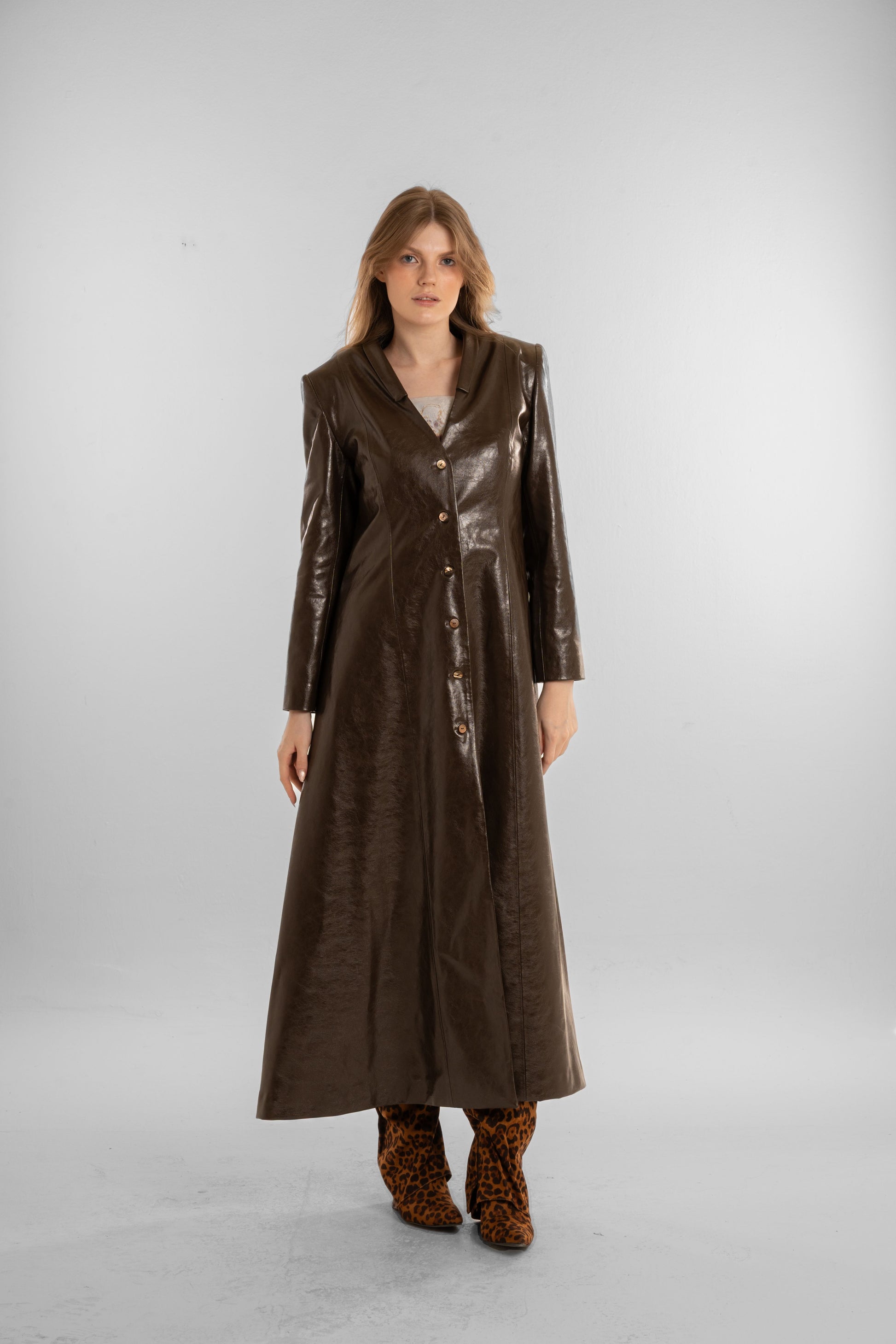 Stylish brown long leather coat featuring a sleek, elegant cut. Warm, durable, and perfect for elevating any outfit with a refined, timeless look.