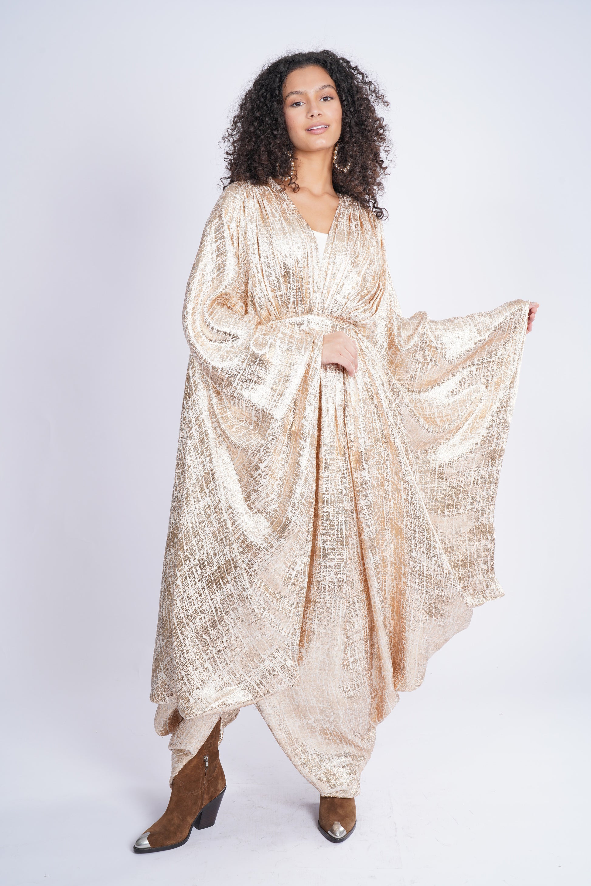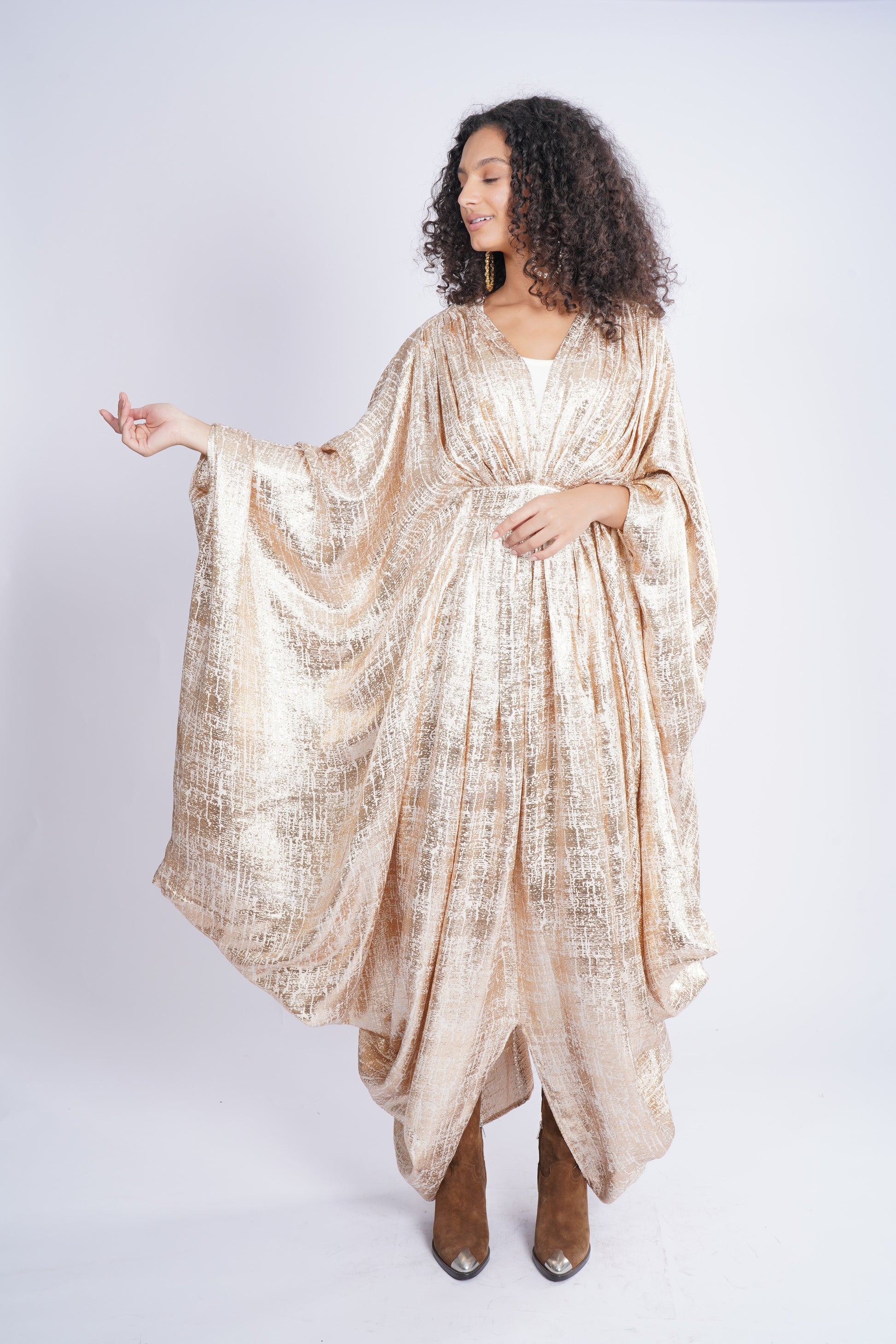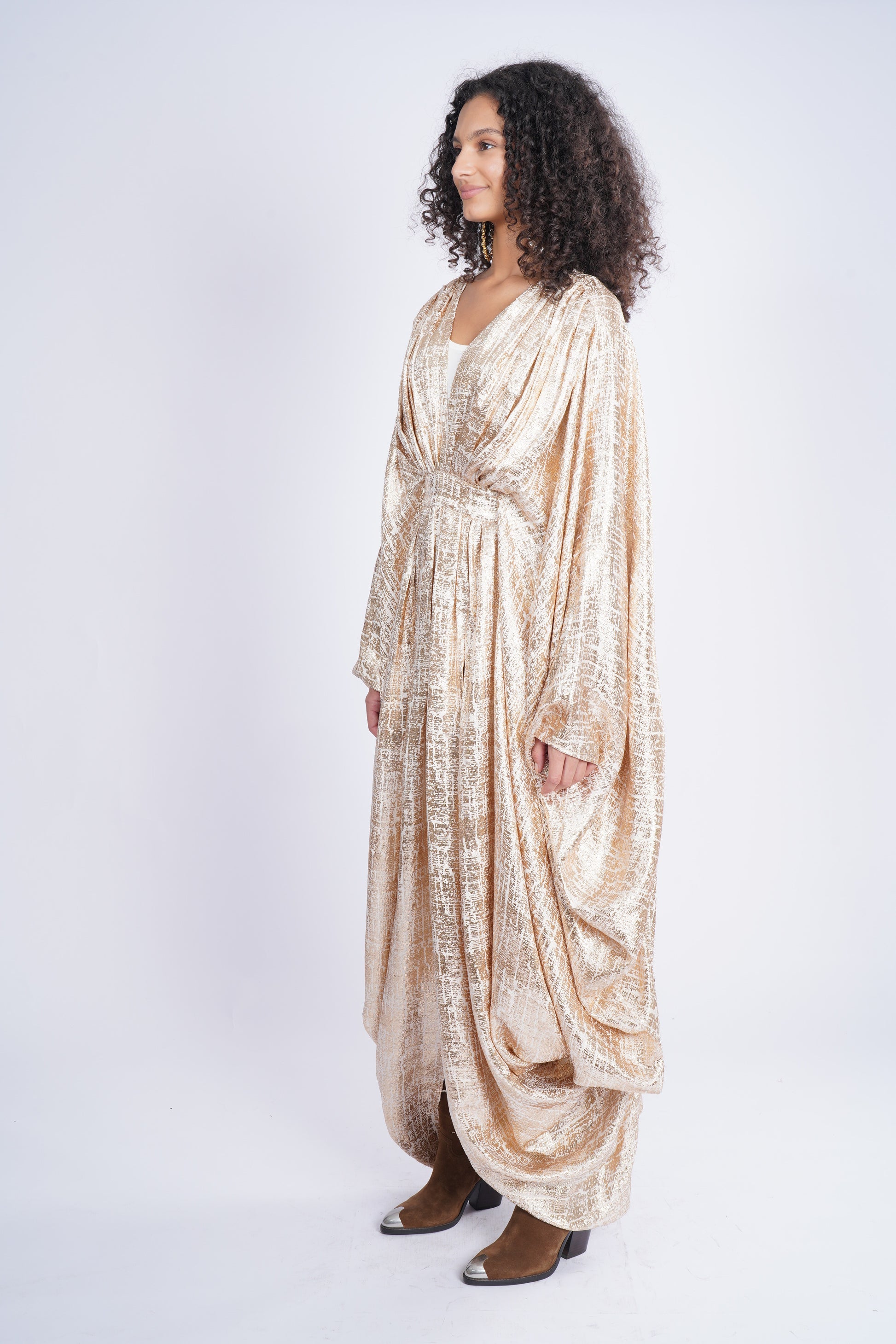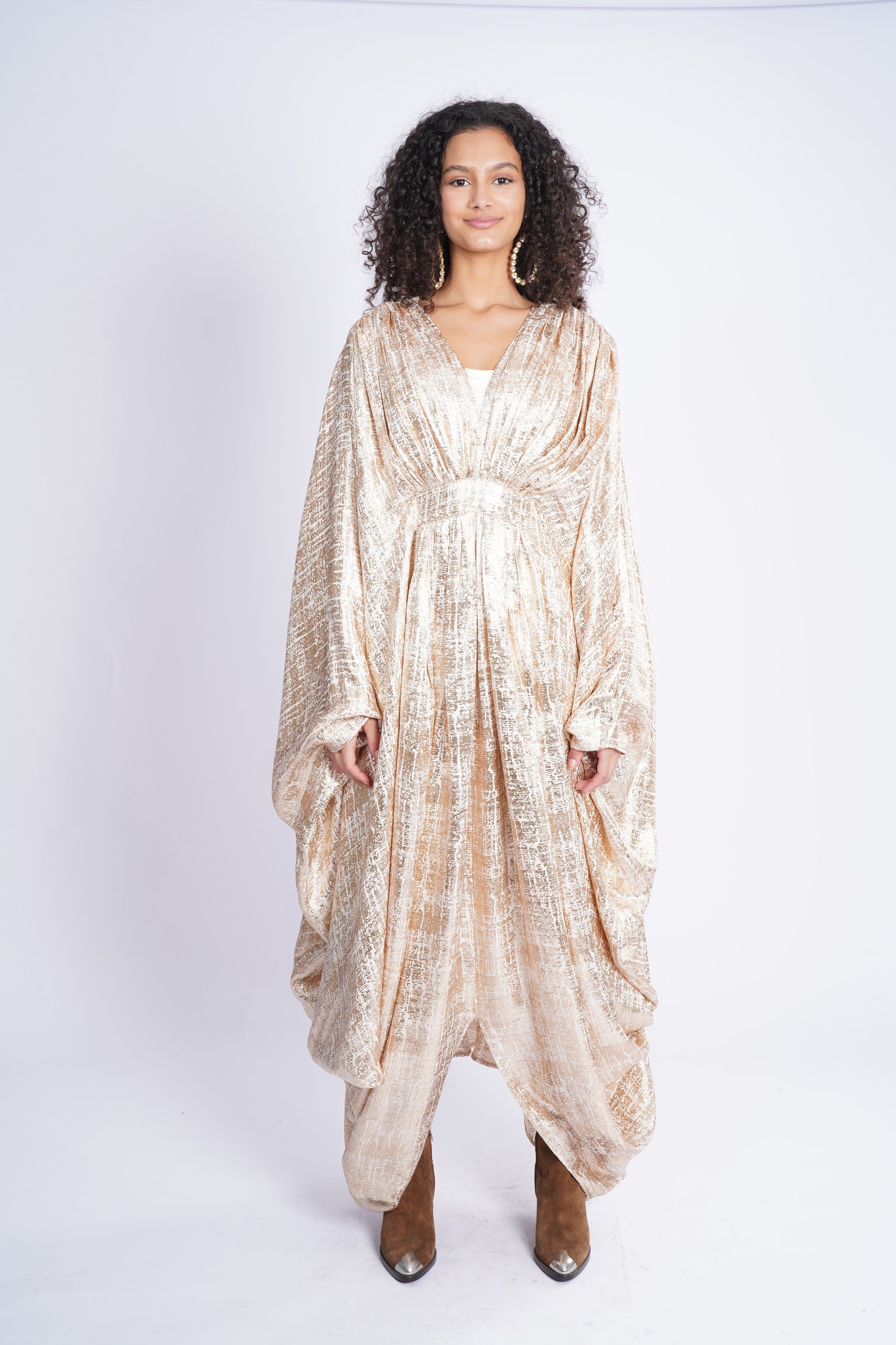 A dress made of silk, with a wide cut and a belt at the bottom of the chest