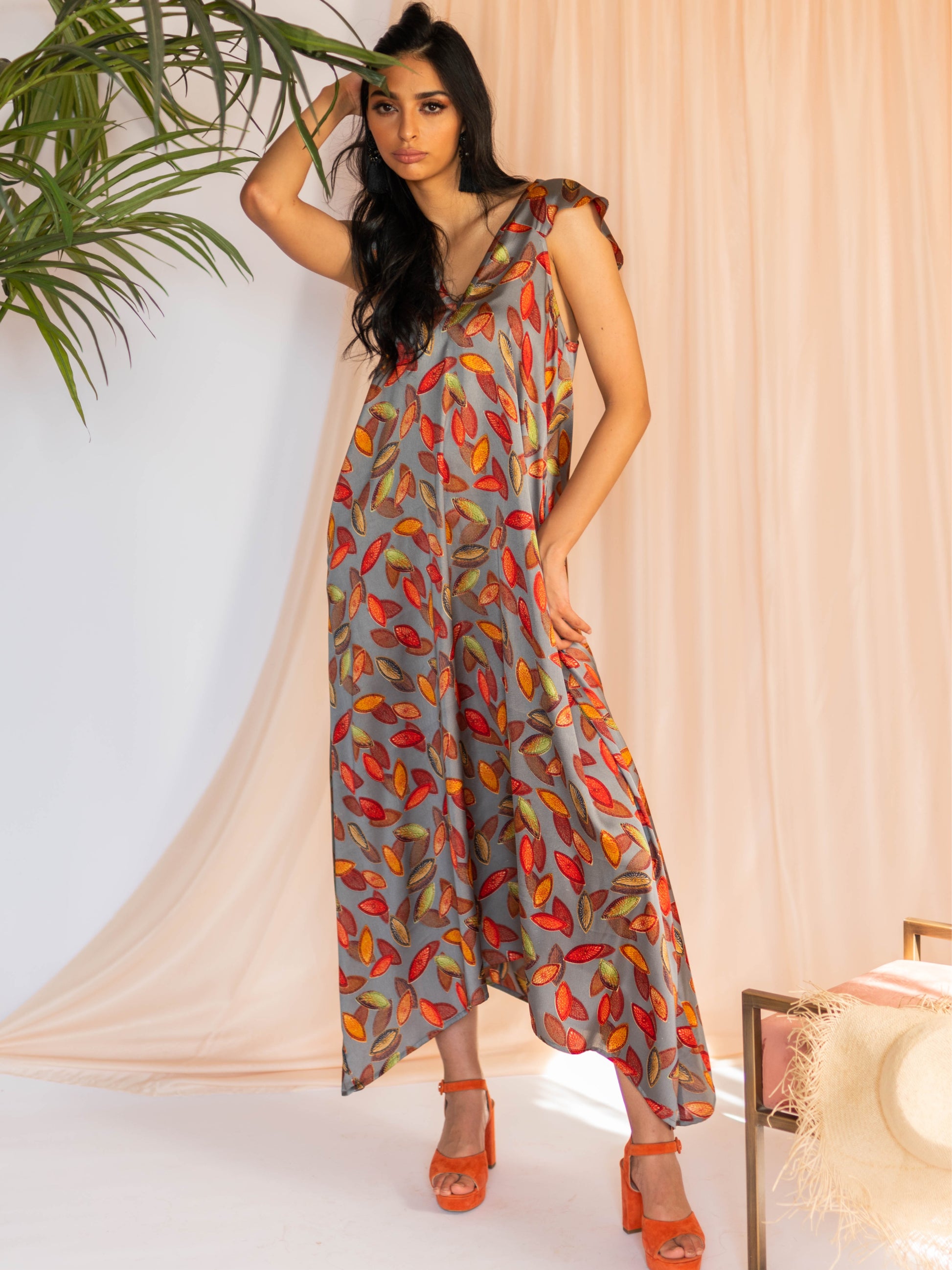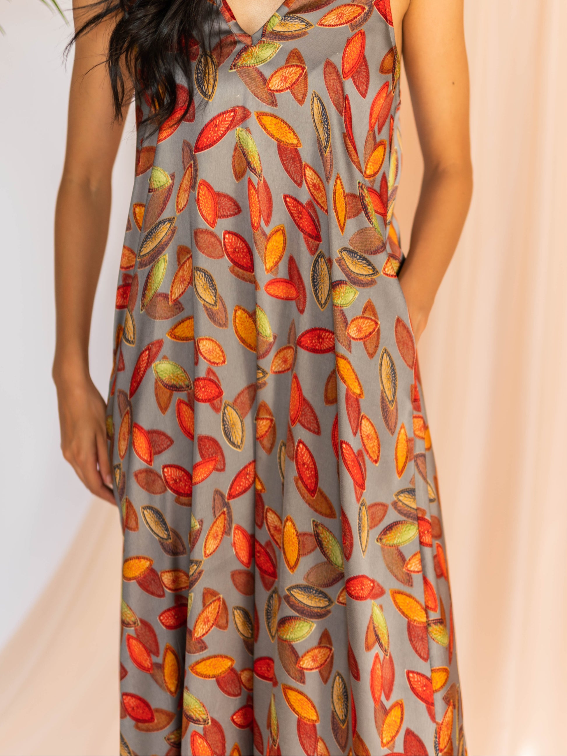 Feel lavish and comfy in MAZOURA falling leaves silk dress, featuring two side pockets and V neckline. Silk from Italy, designed in our atelier.