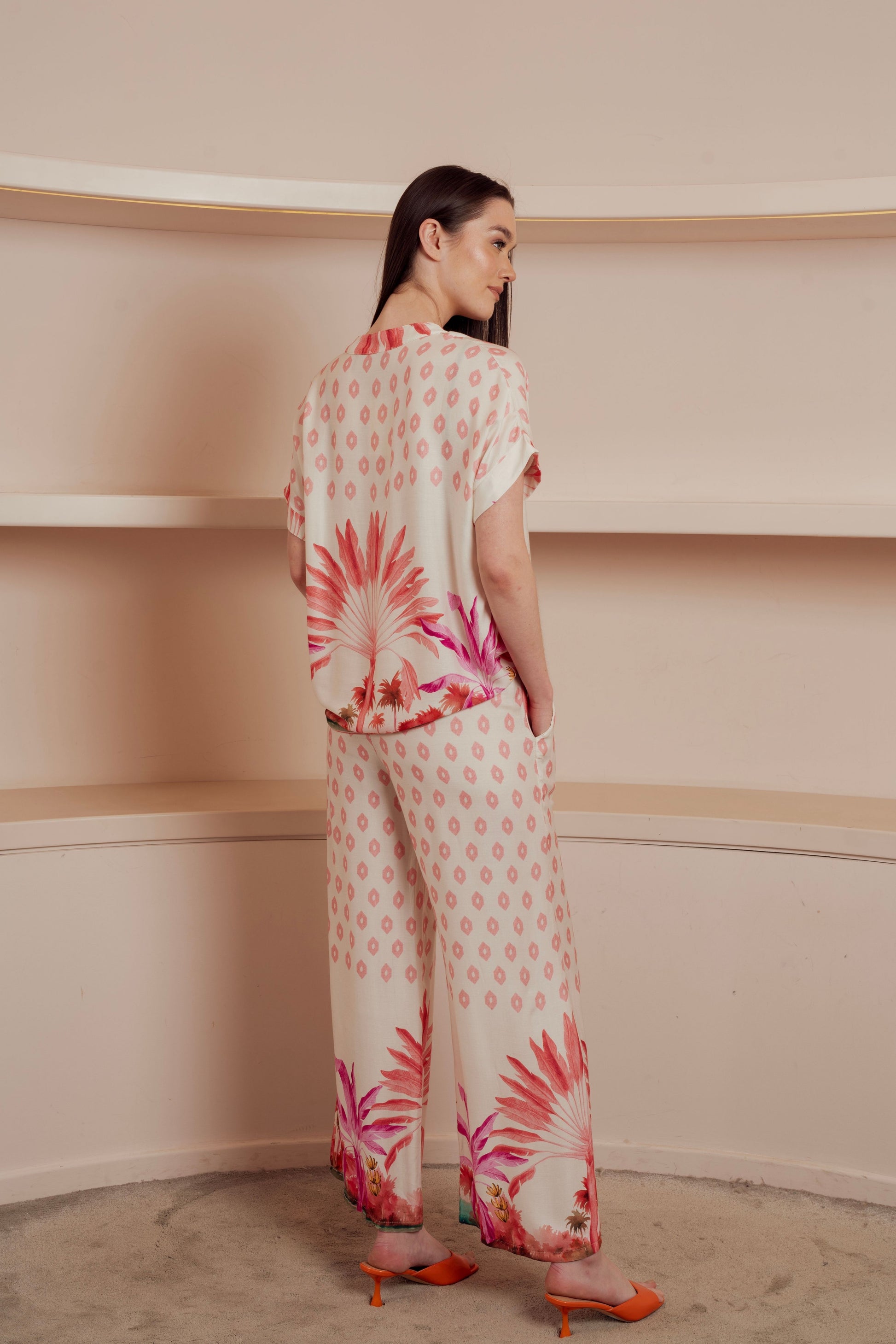 Light button-up blouse with a soft pink geometric pattern and tropical floral print at the hem.