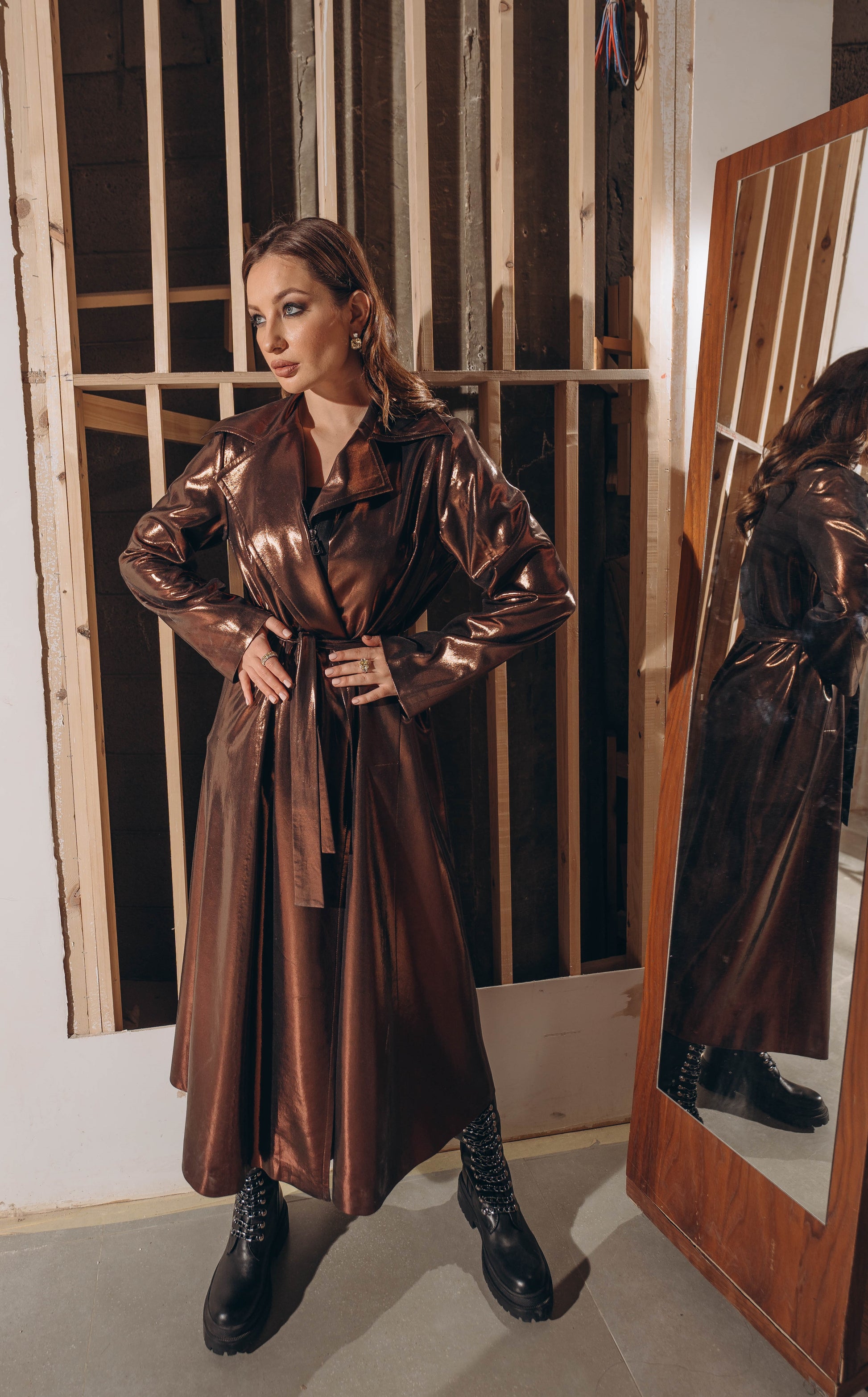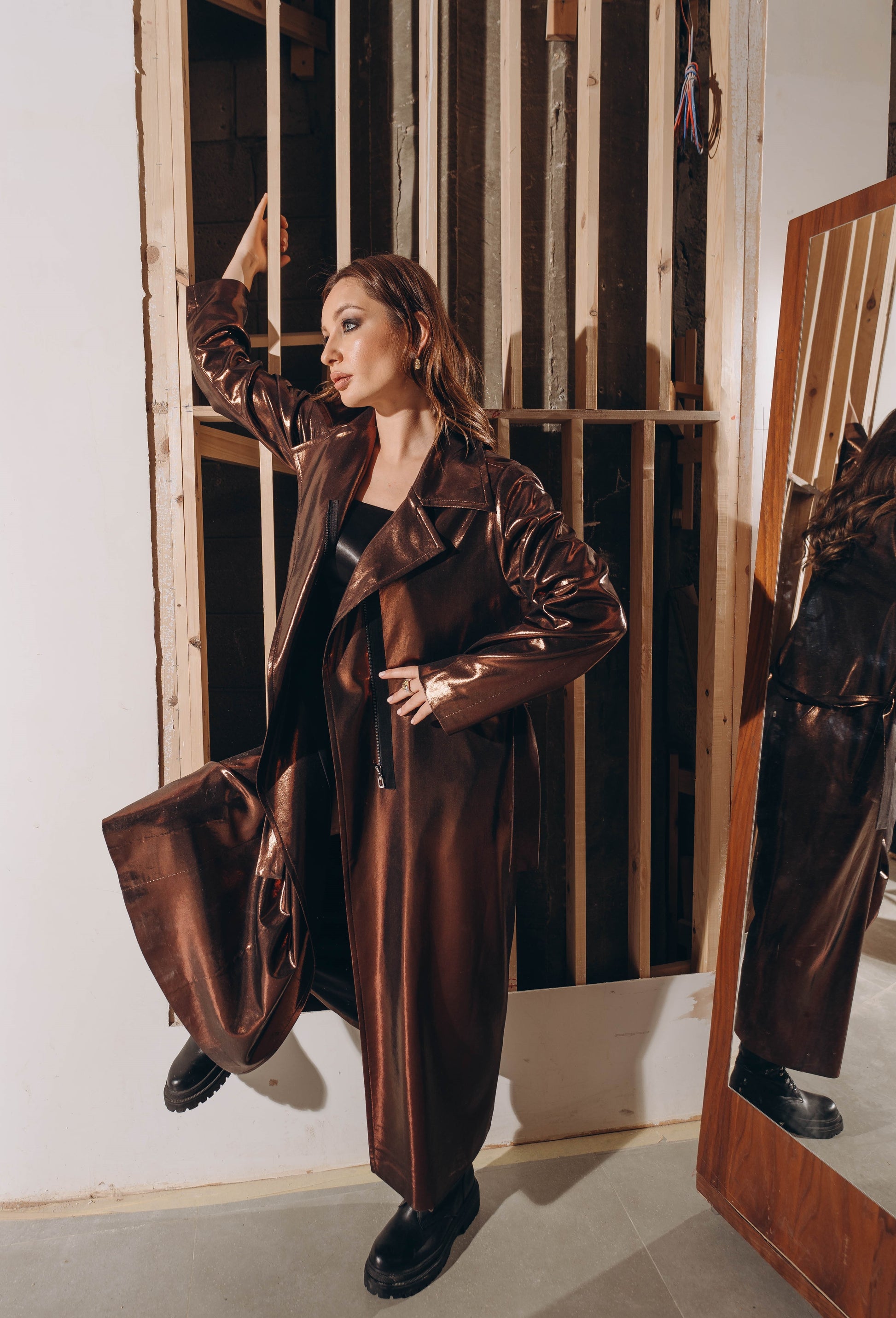 Add some shines to your outfits with our Metallic virgin leather longline trench coat, featuring a notch collar, belt, two side pockets and zipper fastening, fabrics from London, UK. Handcrafted in our atelier in Egypt.