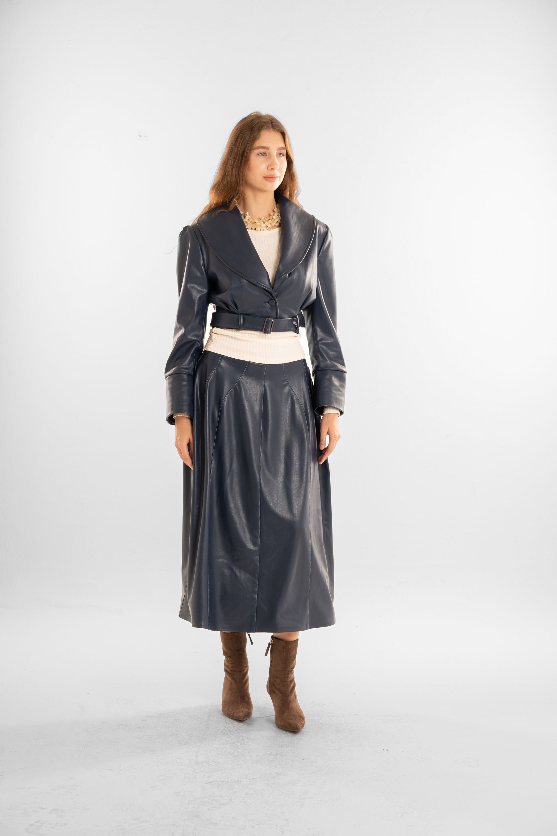 hic navy blue short skirt with a sleek, modern cut. Easy to style and perfect for creating trendy, coordinated outfits—whether paired with a jacket or worn on its own.