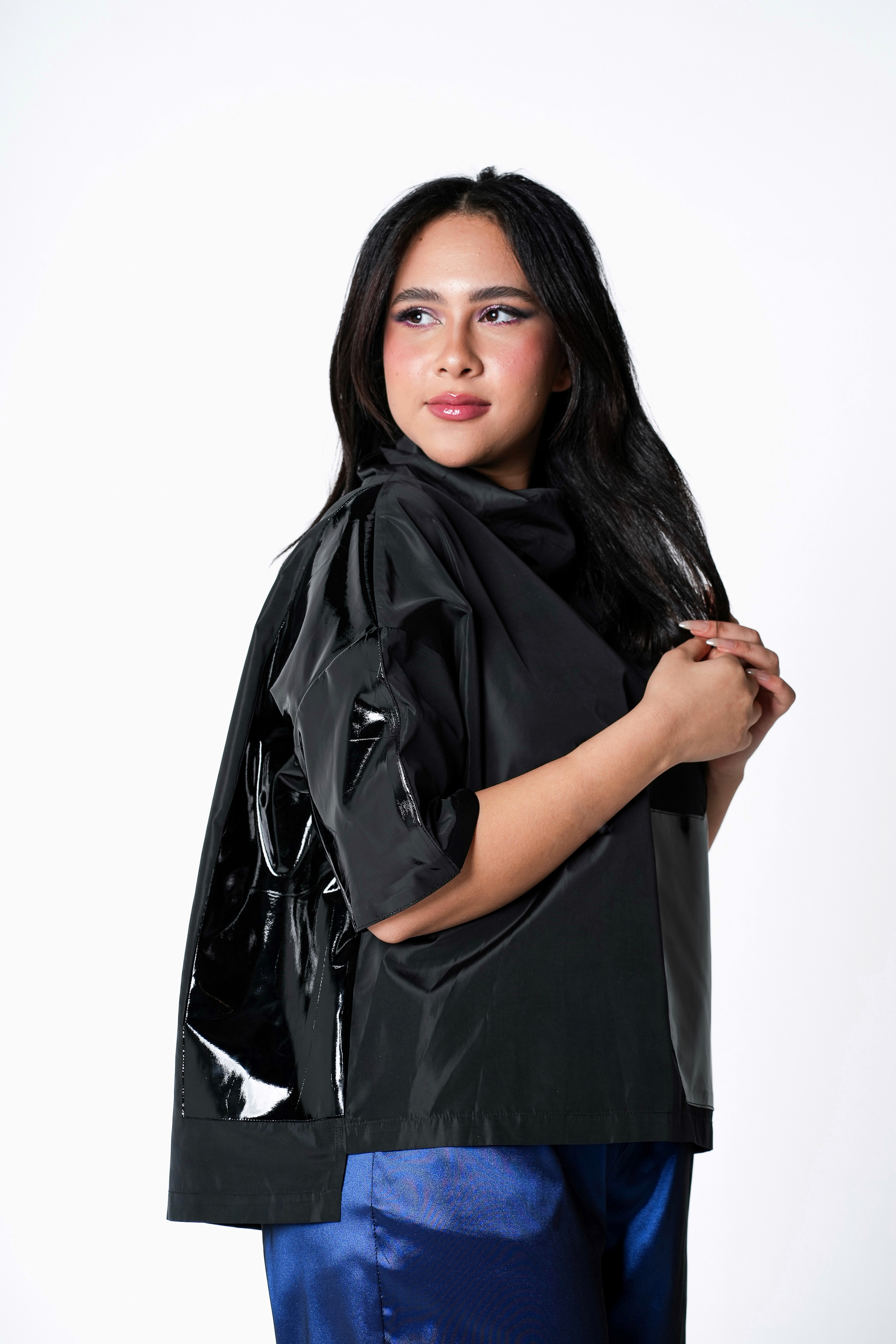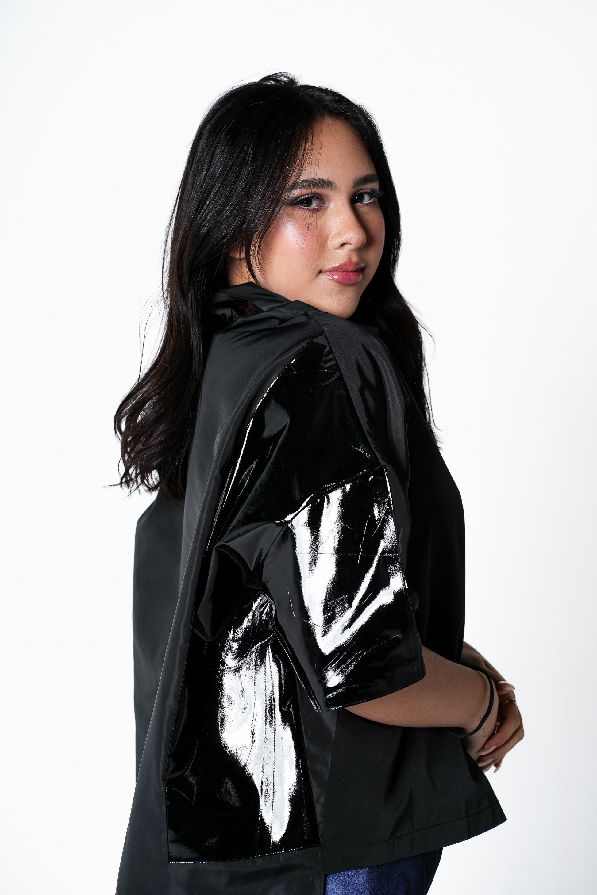 Mazoura Nylon black T-shirt is designed with Comfort & Boldness in mind. It is made from waterproof Nylon fabric and feature a fennel collar with asymmetrical vegan leather cutout detailed. designed for a loose fit.