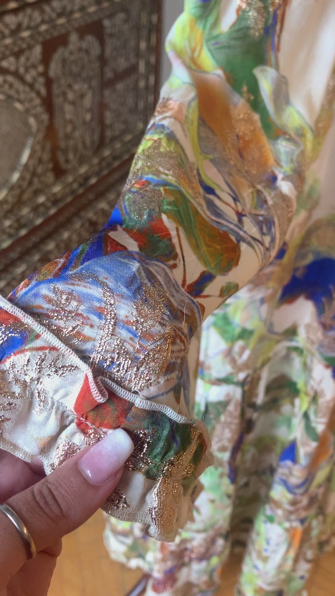 Designed with Genuine Indian fabrics Handcrafted in Egyptian hands, here is our Palette dress featuring wide long sleeves, raffle hem and gold stitches.