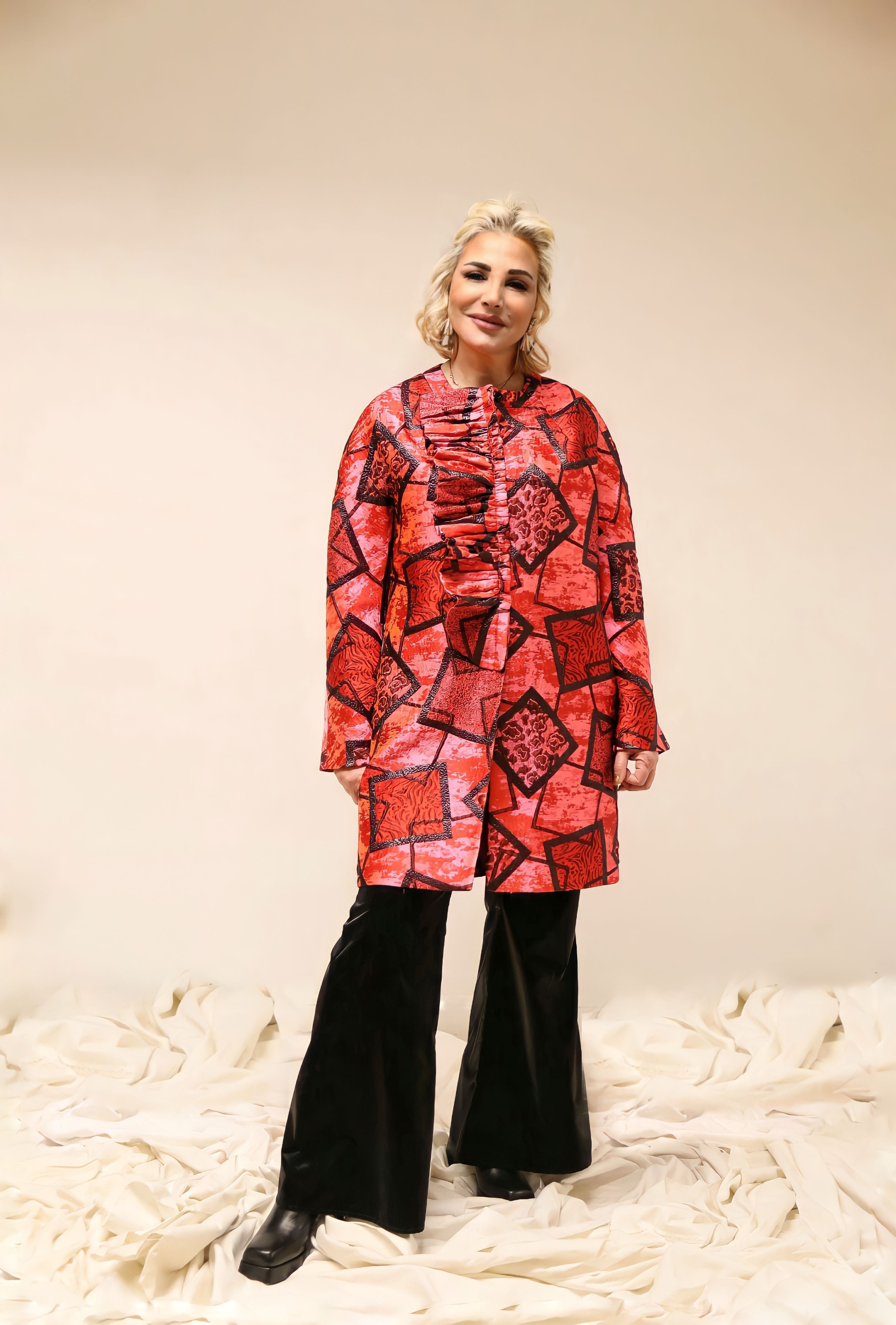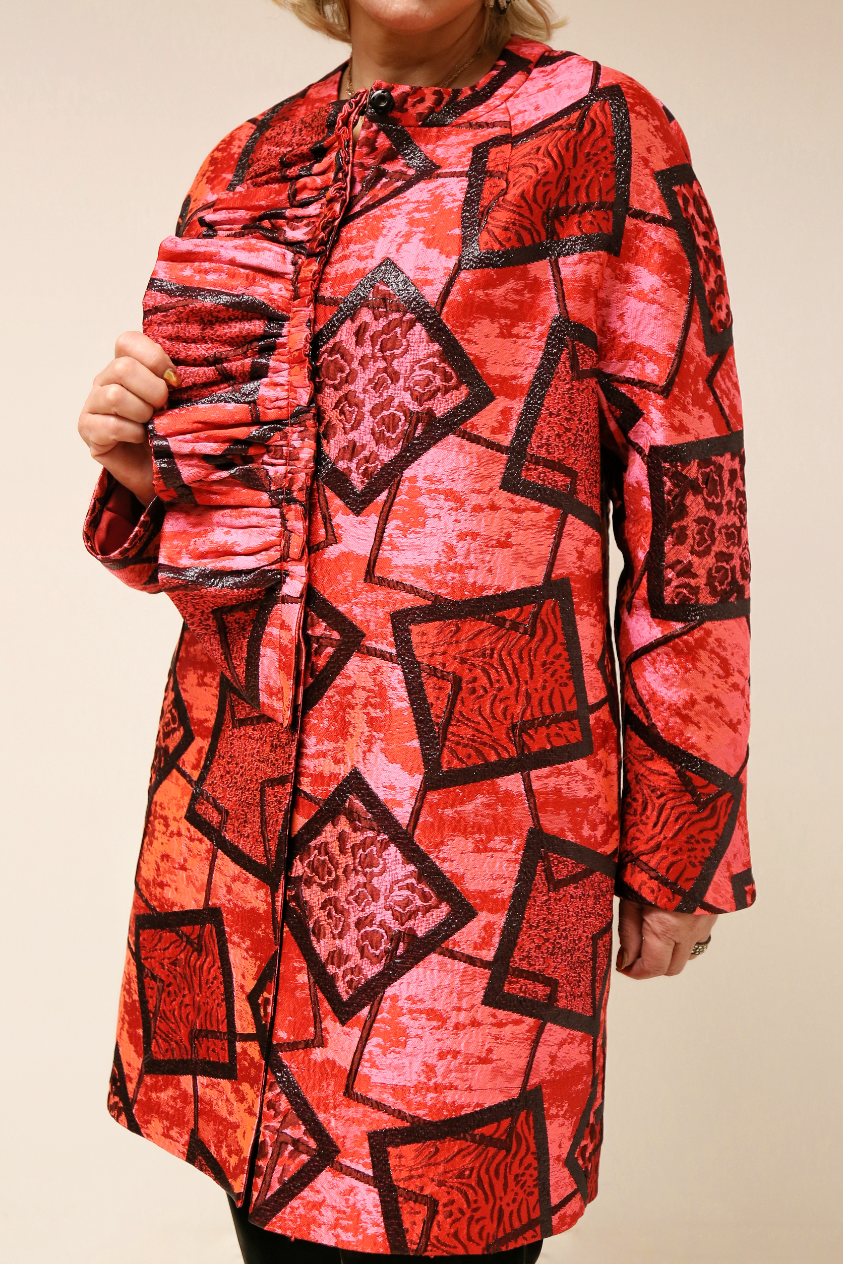 Patterned knee length overcoat inspired by cubist paintings combining tones of reds to pinks.