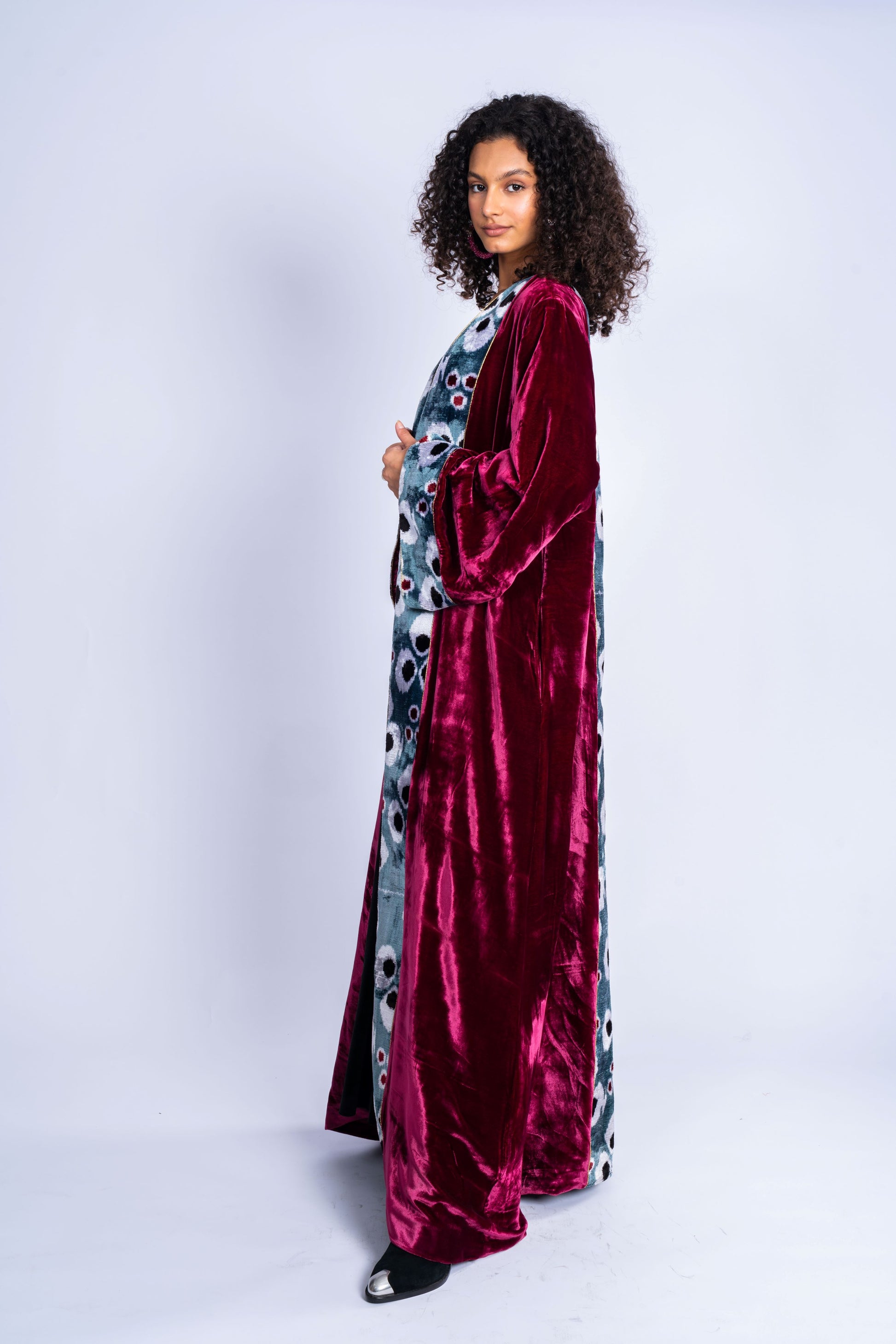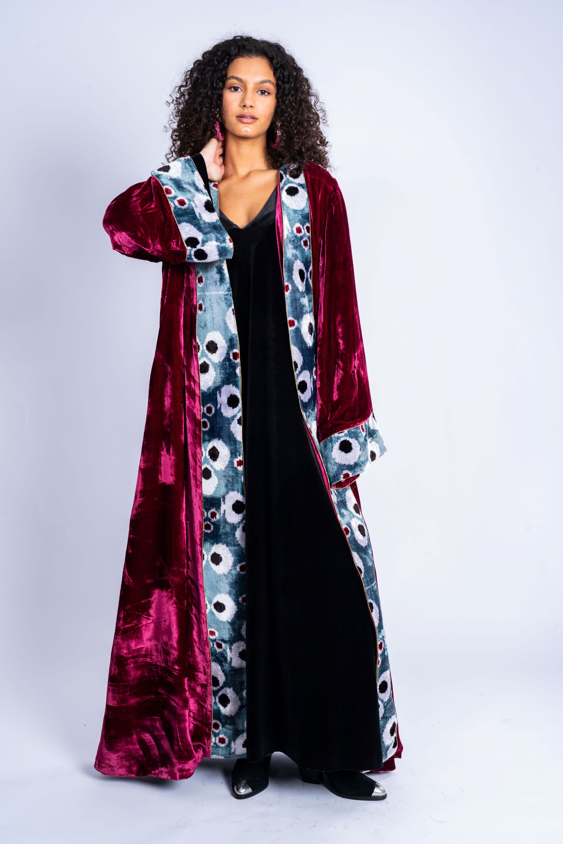 Long coat made of velvet with a distinctive cat fabric.