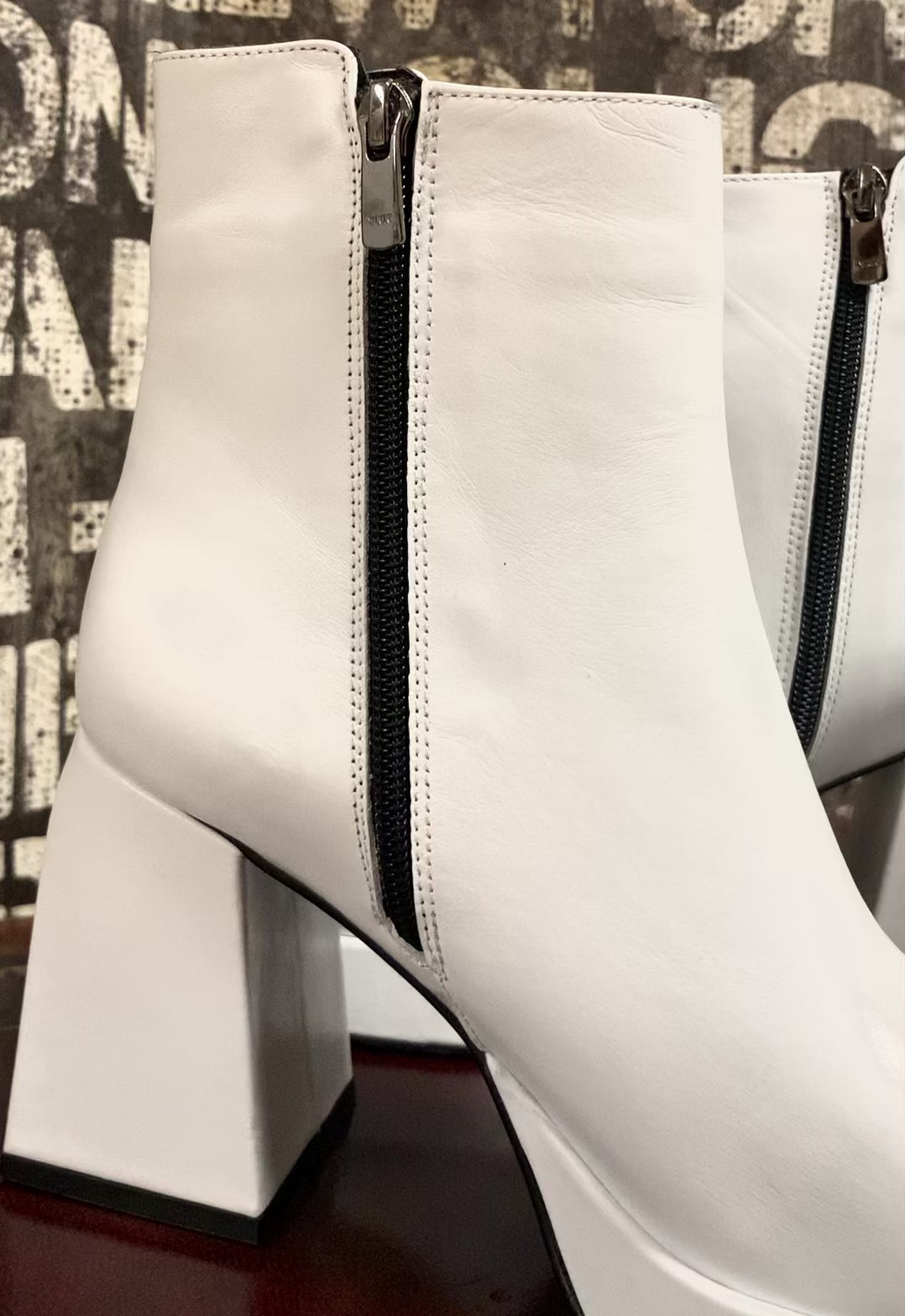White ankle boots made from genuine Italian leather, finished with a robust square toe. This style offers a double closure with zips from either side. She's finished with a memory foam insole, a double zip, and a chunky platformed heel , all paving the way for the perfect comfortable fit.