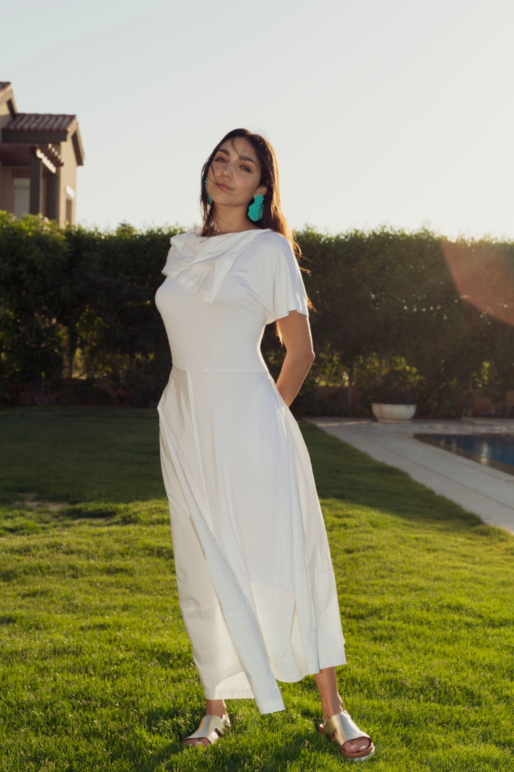 White Asymmetric Flowing Dress.